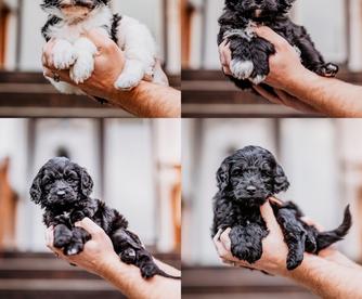 Australian Labradoodle puppies include merle and chocolate. Colors will vary depending on the parent dogs.