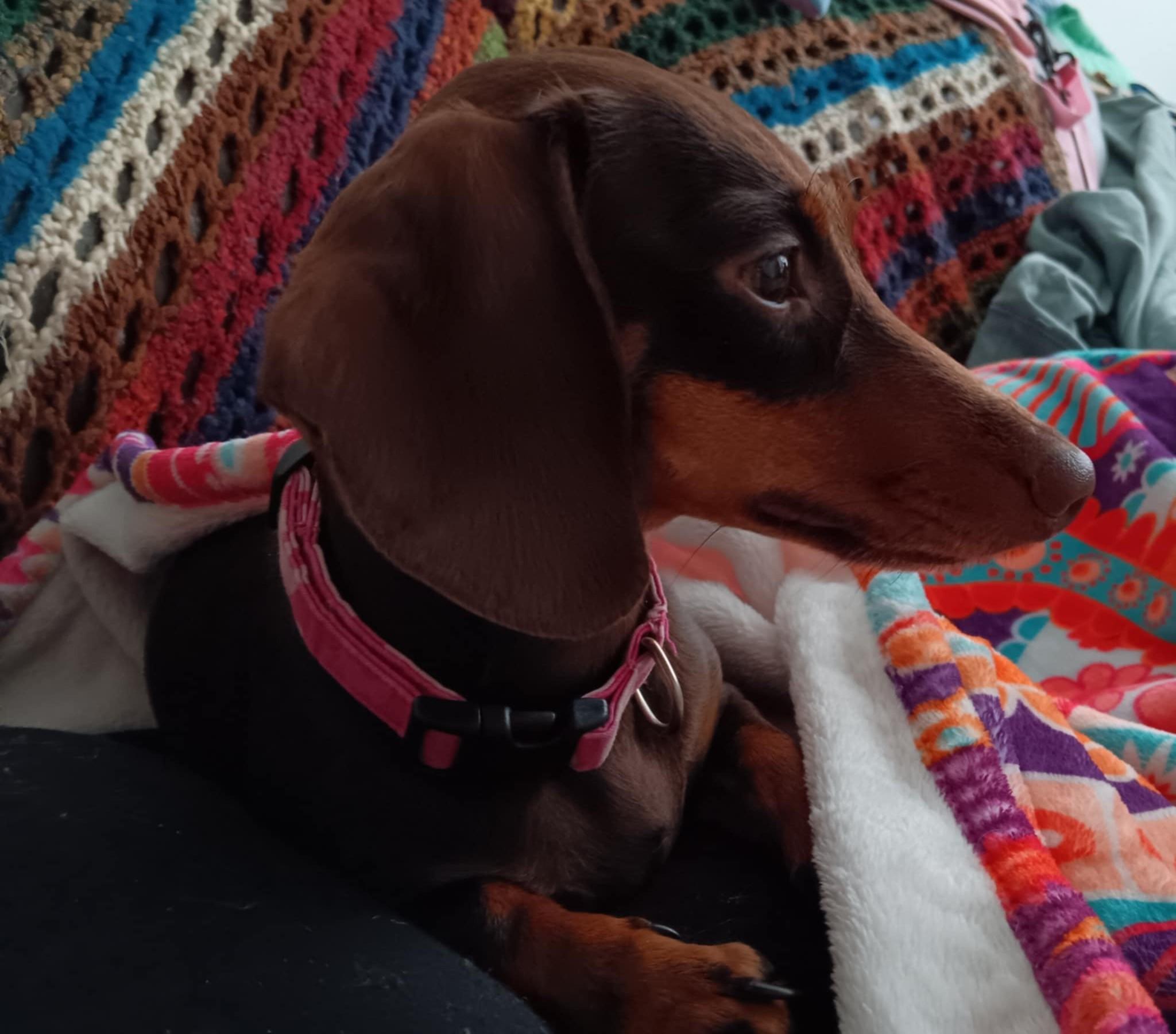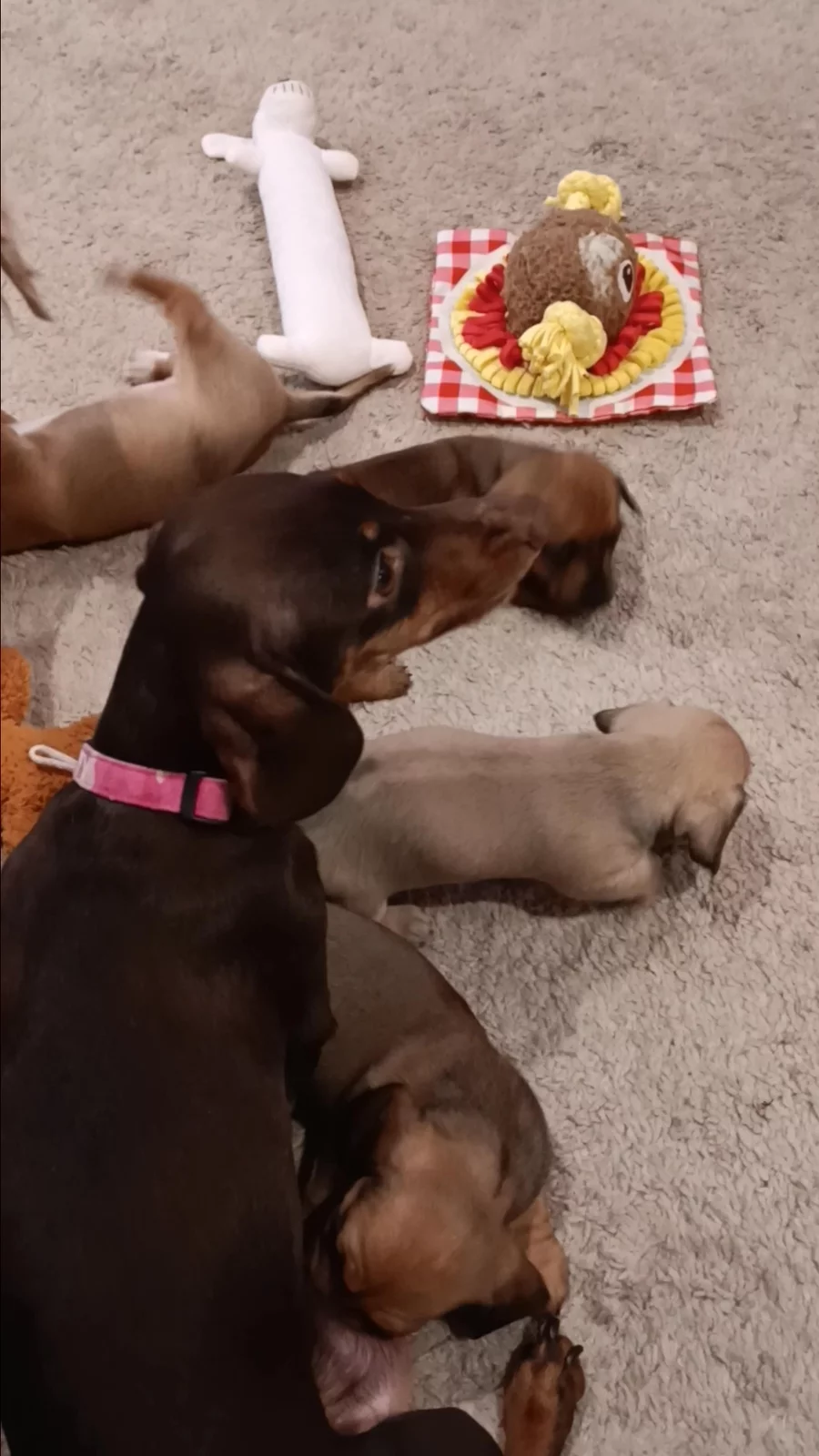 Meet Taffy — our stunning miniature dachshund, weighing in at just 8.7 lbs! This short-haired chocolate and tan beauty boasts a gorgeous topline and an irresistible personality. A recent addition to our program from Arkansas, Taffy has quickly become a standout. She’s playful, especially when it comes to her squeaky toys, and has a calm, loving temperament that makes her the perfect companion. Always by your side and an exceptional mama, Taffy is a true gem, and we’re thrilled to have her as part of our breeding family.