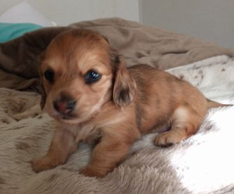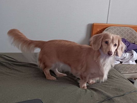 Maya is a 9 pound longhaired, chocolate-based cream dapple female with a gentle spirit and a love for belly rubs and cuddles. She is not only beautiful but also carries an impressive pedigree—her lineage traces back to Sniffntell, a highly regarded import from a renowned Canadian show line. Maya is proud to be a first-generation Em-Me's Royal 'n Loyal Dachshund.