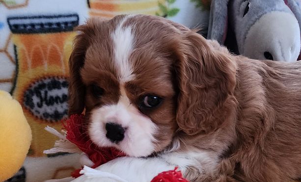 Our puppies include blenheim, ruby, black and tan, and tri-color. Colors will vary depending on the parent dogs.