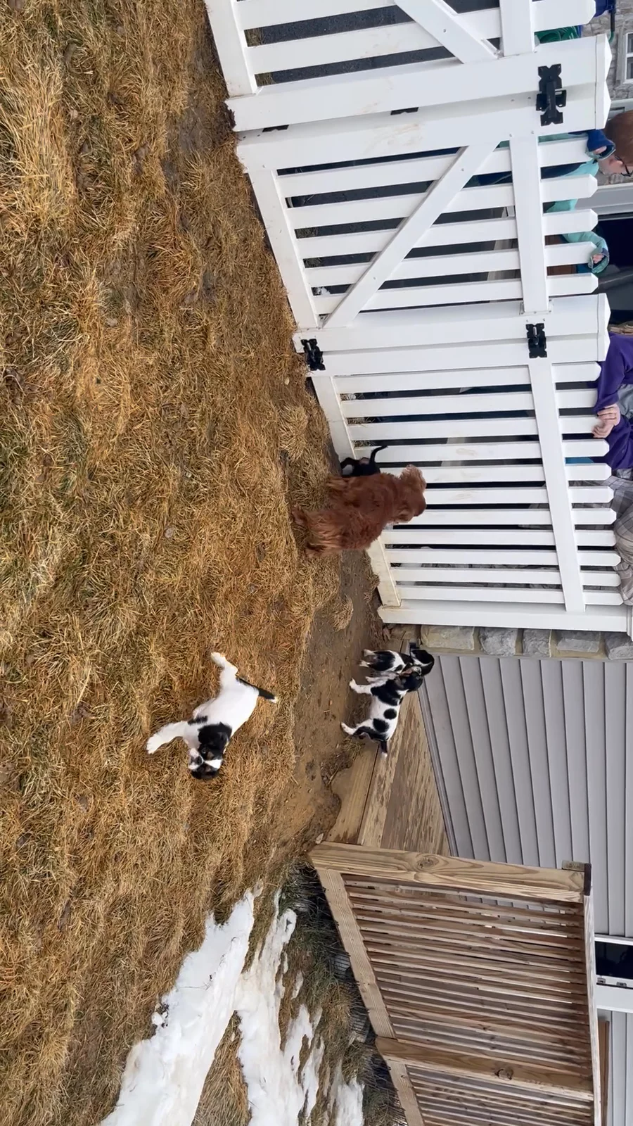 Today the puppies all learned how to go to the big yard with the pack! They learned to navigate a ramp, follow through a runway, out a door onto the exterior decking, then off into the yard! The full yard is still snow-covered, but the area we cleared for the dogs to potty in was clear enough for them to romp in.