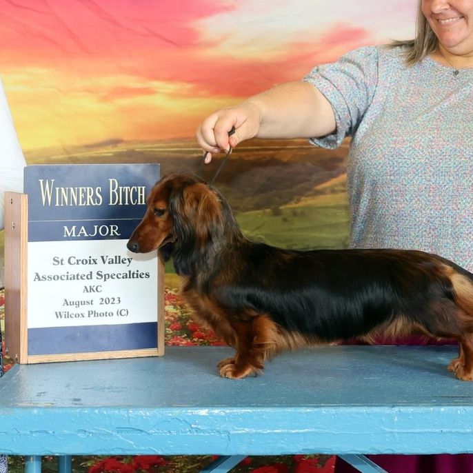 My journey into dachshund breeding started about five years ago.. not in the show ring, but with a dachshund that completely stole my heart. I got my first dachshund from a breeder I later realized wasn’t operating ethically. While my dog was amazing and brought so much joy into my life, I quickly learned the importance of health testing, responsible breeding, and doing right by the breed. I learned alot over the years and have transformed my program into something I am proud of and cant wait to grow and floruish and make my mentors proud. That experience sparked something in me. I knew I wanted to do better, not just for my own dogs, but for other families looking for healthy, well-bred dachshunds. Since then, I’ve committed myself to learning everything I can about the breed, and a couple of years ago, I began showing my dachshunds to continue improving their structure, temperament, and overall quality.