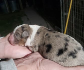 Ladybug is a fun loving medium to high drive girl. Bright blue eyes that she tends to pass on, is clear on Aussie genetic panel. Weights 45 pounds or so. She's registered with AKC, ASDR, CKC...