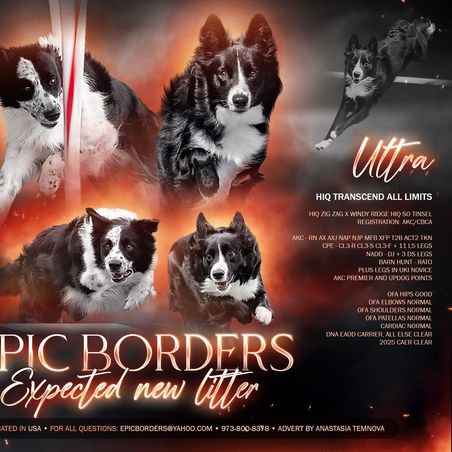 Epic Borders is excited to announce a planned sport litter! Ultra has a date with her boyfriend Moss for mid-Sept to Oct 2025. Puppies will go home early 2026. Puppies will be AKC registered (or CBCA if going to Canada). Both Ultra and Moss are accomplished in sports and just lovely to live with.