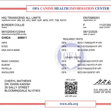 Epic Borders reports to performing the health tests below on their breeding dogs. Ask your breeder about the tests performed on the parents of your litter. Learn more about health testing for Border Collies.