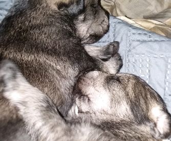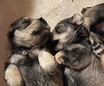 Our puppies include salt and pepper, black, and black and silver. Colors will vary depending on the parent dogs.