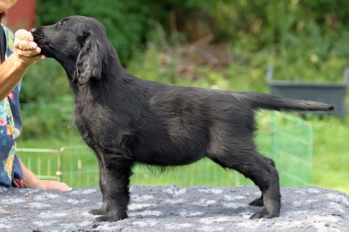 Elsa is a female Flat-Coated Retriever. Carefully selected as a great representative of her breed, Eva decided to make her part of their program. Eva has passed Good Dog’s screening process, which involved a review of their breeding practices, environment, and the mental and physical health of their dogs.