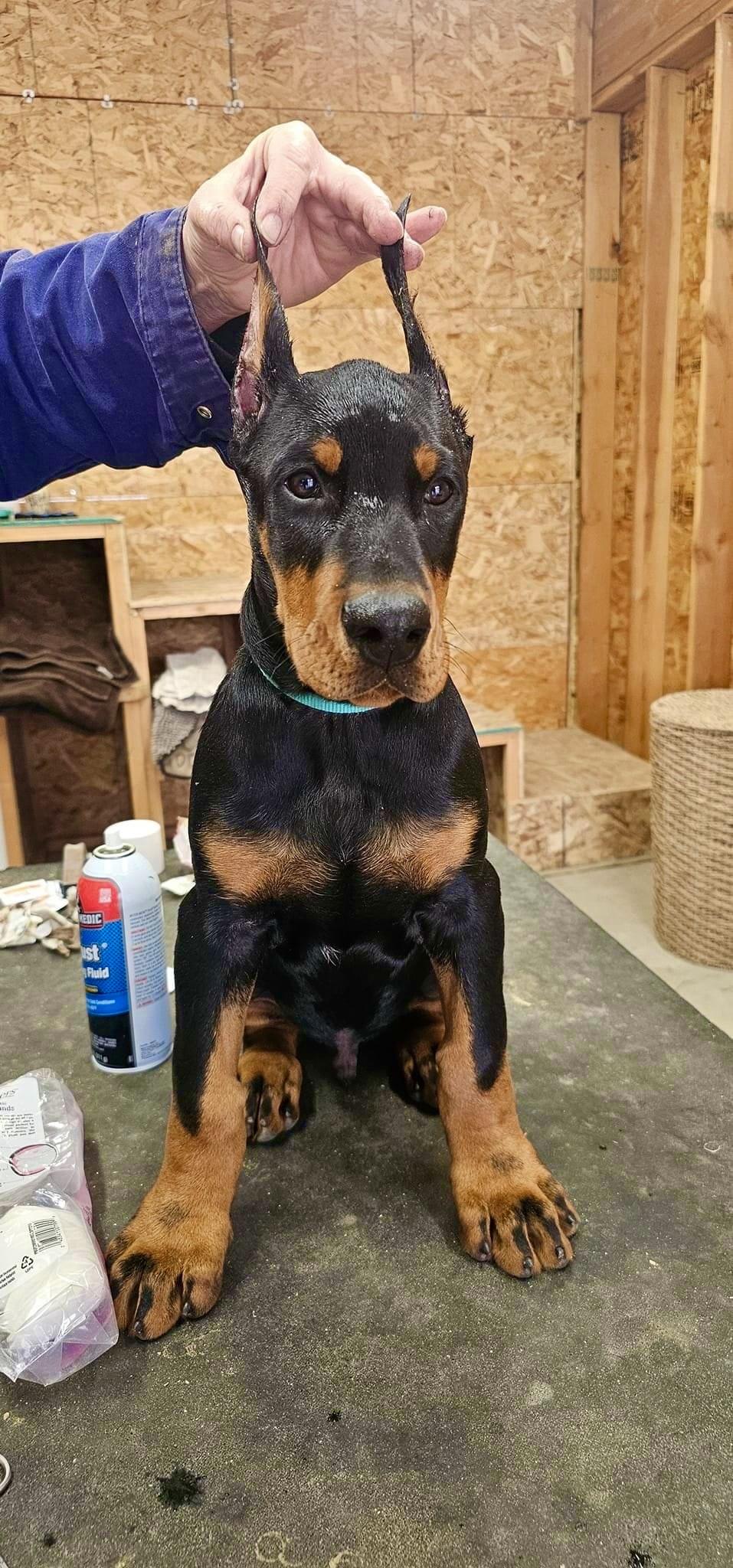 “Puppies will be AKC registered. They'll be up-to-date on their wormings, vaccinations, and be micro chipped. Their tails are docked and ears will be cropped by the famous Dr. Midgarden. Deposits are nonrefundable, but can be transferred to a different puppy if the buyer so chooses.”