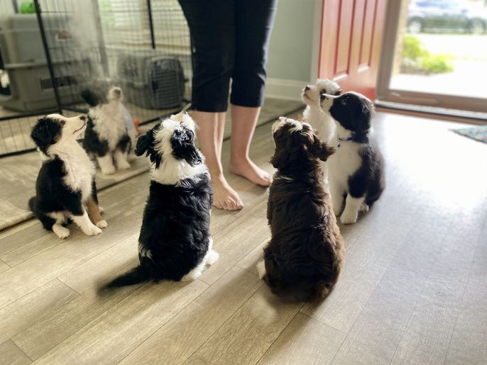 Our puppies include blue merle, black and white, and black tri-color. Colors will vary depending on the parent dogs.