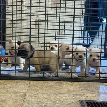 Our French Bulldog puppies are cream. Siberian Husky puppies include red and white, brown and white, agouti and white, and black. Colors will vary depending on the parent dogs.