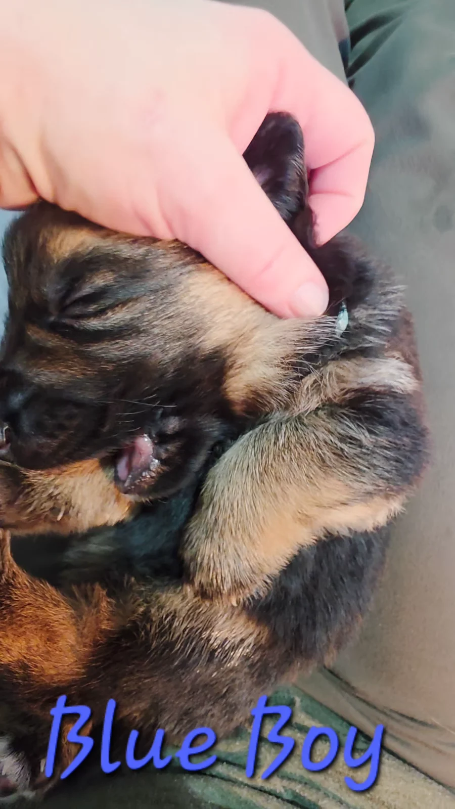 Blue Boy — 2 Weeks Old 🎥 Blue responds to stimulation appropriately for his age — gentle hind leg movement with belly rubs and some early paw mouthing as he explores through touch. What stands out most right now is his demeanor. He tends to settle more quickly than his littermates and carries a naturally laid-back presence. There’s a quiet ease about him — observant, comfortable, and unhurried. He reminds us very much of his sire, Ares — sweet natured, steady, and calm in contrast to the impressive IGP3 title he holds. Developing beautifully and right on track. (Tabby/Ares)