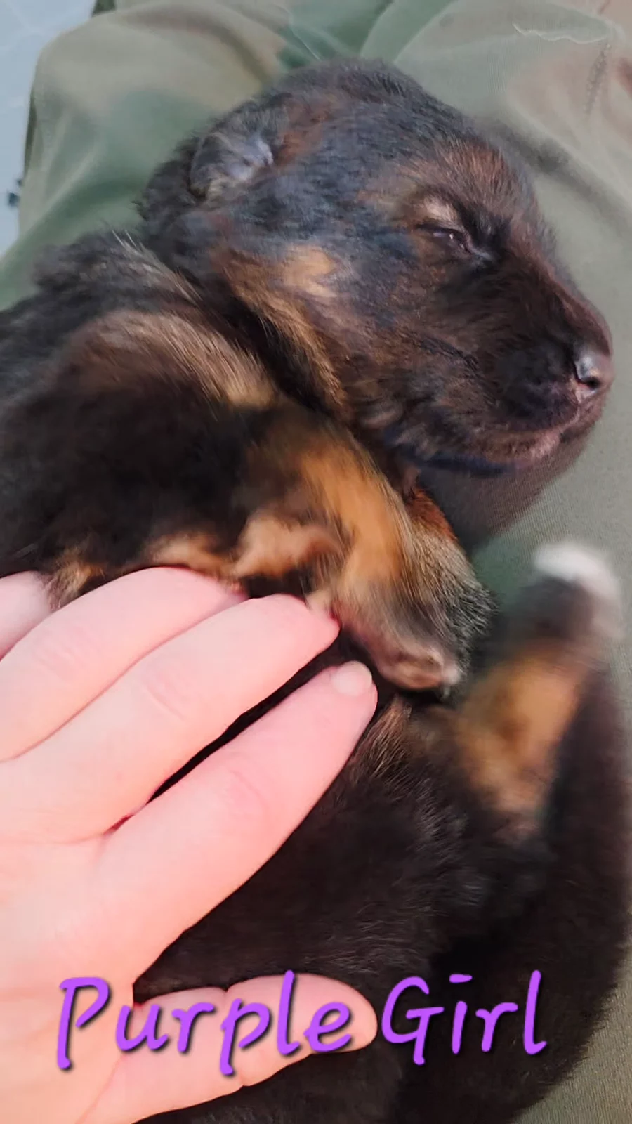💜🐾 PURPLE GIRL 7 WEEK UPDATE 🐾💜 (Tabby/Ares) Purple Girl is full of personality and confidence. She is very outgoing, super affectionate, and absolutely loves being right with her people. She is clearly the alpha female of the group and has no problem letting her brothers know how things are going to go. She carries herself with a natural confidence and assertiveness that stands out right away. She is also very smart and quick to engage. The moment you sit down, she is the first one in your lap, ready for attention and interaction. She’s shaping up to be a bold, affectionate, and highly people oriented girl with a lot of presence and personality 🐶✨