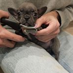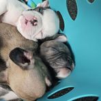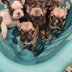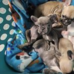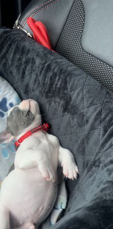 The pups had their first vet visit and received their first rounds on vaccines on Friday! They all did great and none of them even made a cry during their shots. Their fecals came back negative for any parasites as well, which is great! We have started to offer soaked kibble instead of mush, and they LOVE it! All of them are doing great with the new food texture and eat it up like Frenchies love to do!! All the puppies weighed in at about 2.5lbs and they are all doing great ❤️ They all slept on the car ride and we are going to start taking them on short car trips to make sure they have that exposure prior to going to their new homes!
