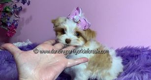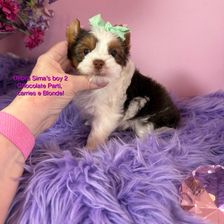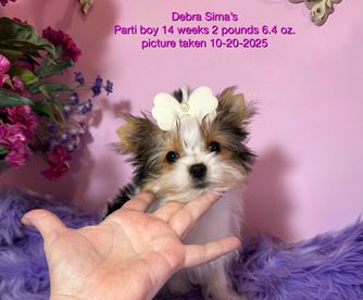 Belle is a Chocolate Parti that is a beautiful girl that loves life and people! She loves to cuddle but also could be active if we wanted to play! Very happy Sweetheart 💗 AKC registered with a lovely coat and very good knees! Weight varies, low is approximately 6.5 pounds and high is 7 pounds, nursing etc varies the weight.