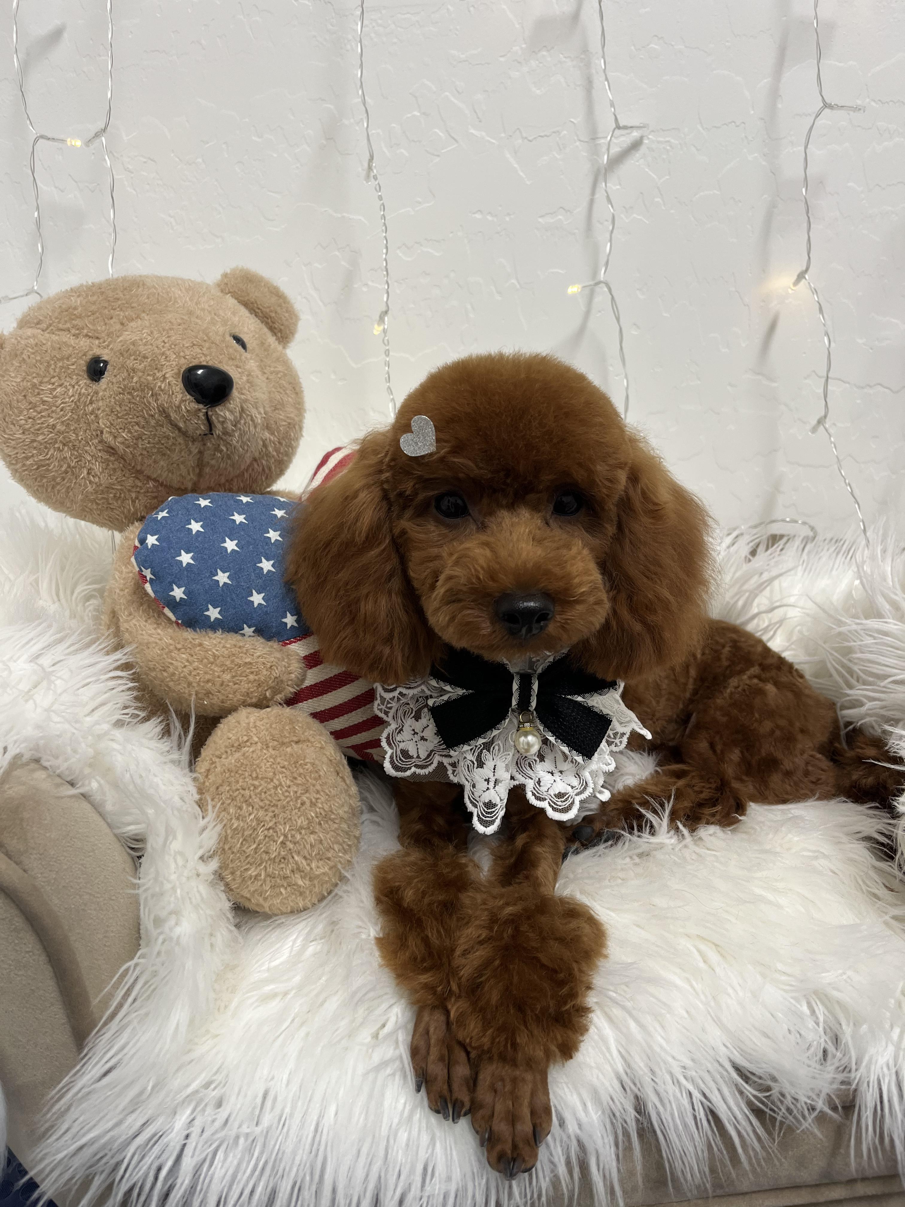 Milky is a female Poodle. Carefully selected as a great representative of her breed, Fabiola decided to make her part of their program. Fabiola has passed Good Dog’s screening process, which involved a review of their breeding practices, environment, and the mental and physical health of their dogs. she is an AKC . She is a very obedient and good mother who takes good care of her puppies.