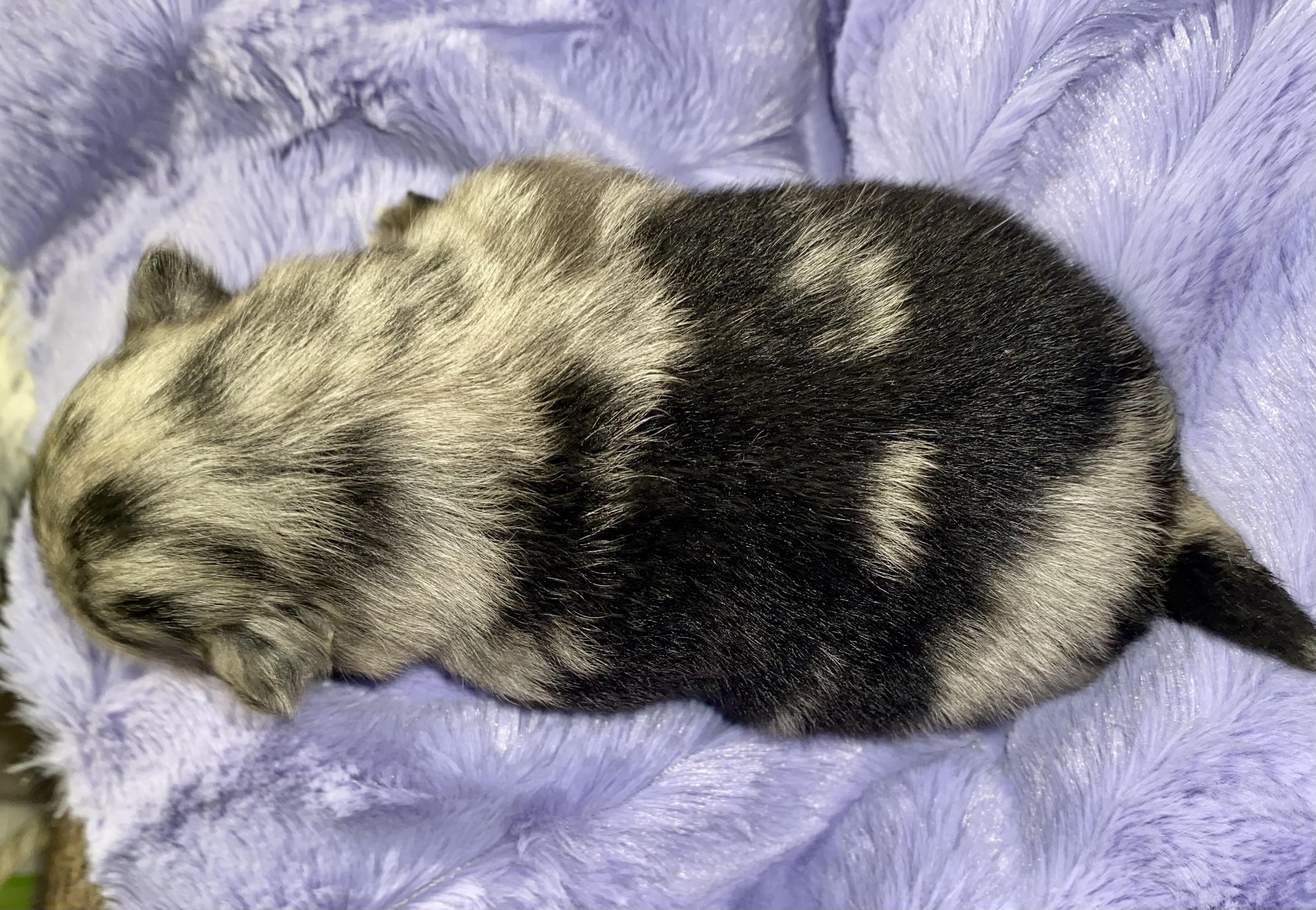 Kisses when she is at the right age, will join our breeding program. She is a Chocolate Dilute Merle. She has a clam and very sweet personality! I am excited to watch her blossom into a fine healthy adult. 💖🐾