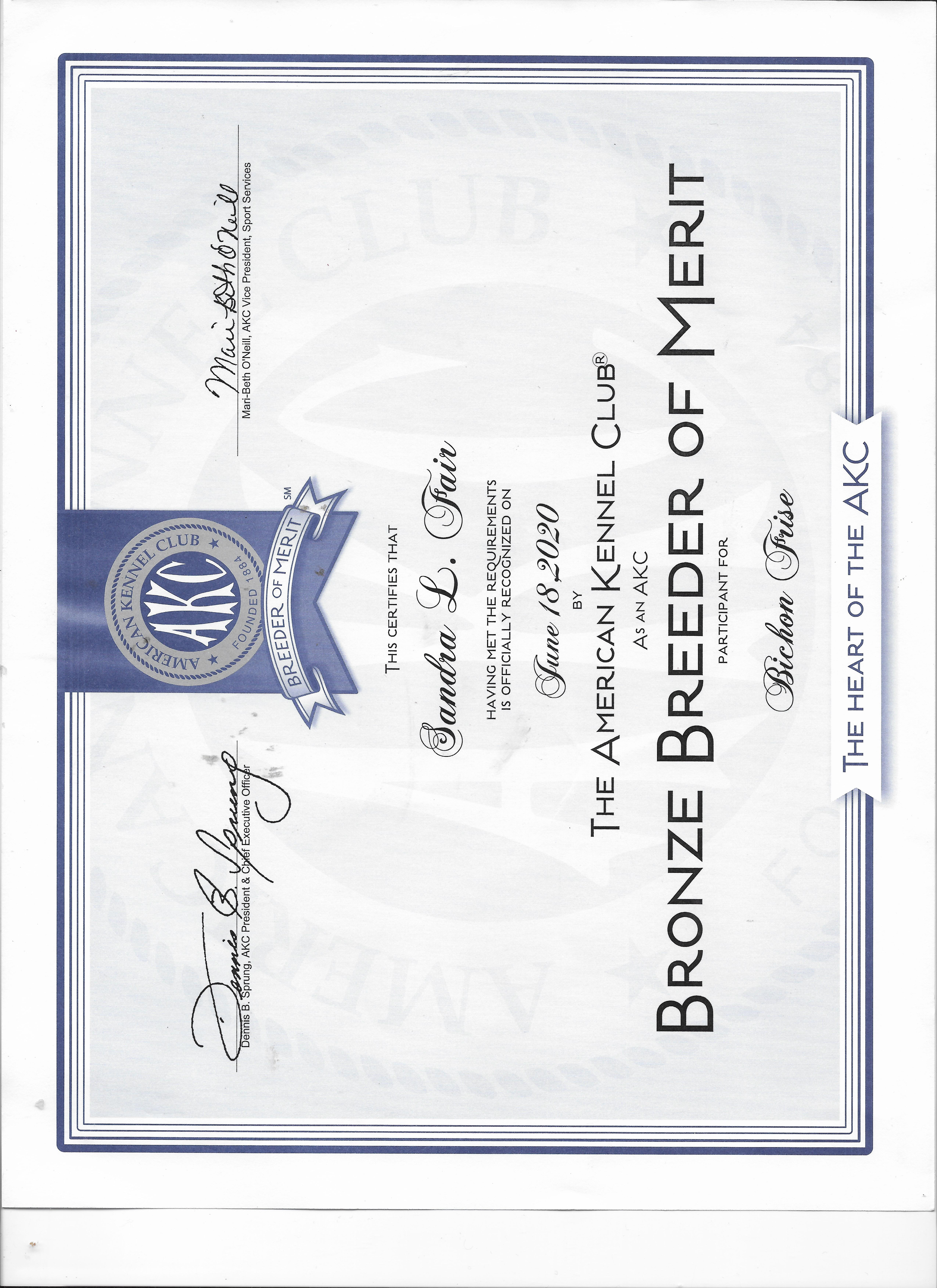 Fairspride Bichon Frises meets or exceeds our community standards in these areas:
