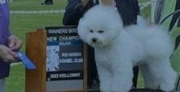Jasper is even tempered, wonderful with all ages and so kind to other Bichons. He loves all humans and is so sweet with the puppies he has sired. He is a wonderful show dog and truly loves the show ring. He loves playing with children and is always happy. HE HAS NEVER EVEN GROWLED AT ANOTHER CANINE.