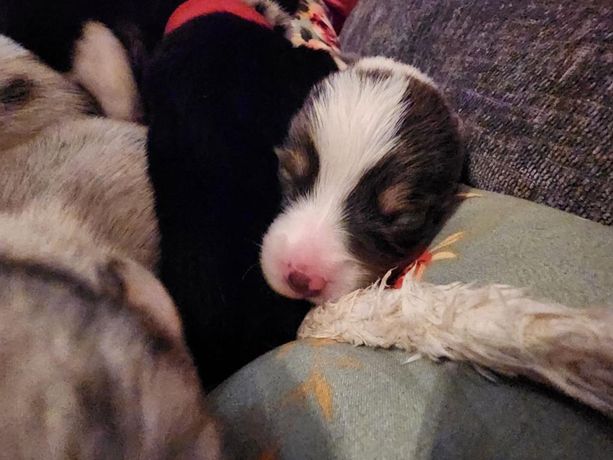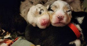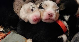 Our puppies include gray and white, blue merle and white, and black and tan. Colors will vary depending on the parent dogs.
