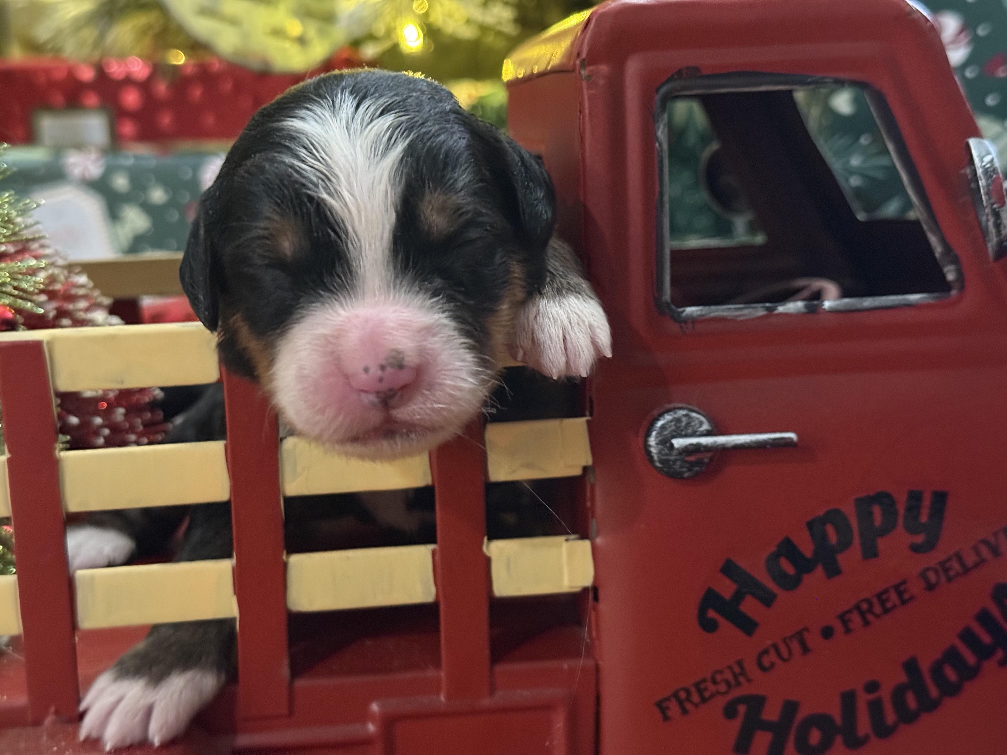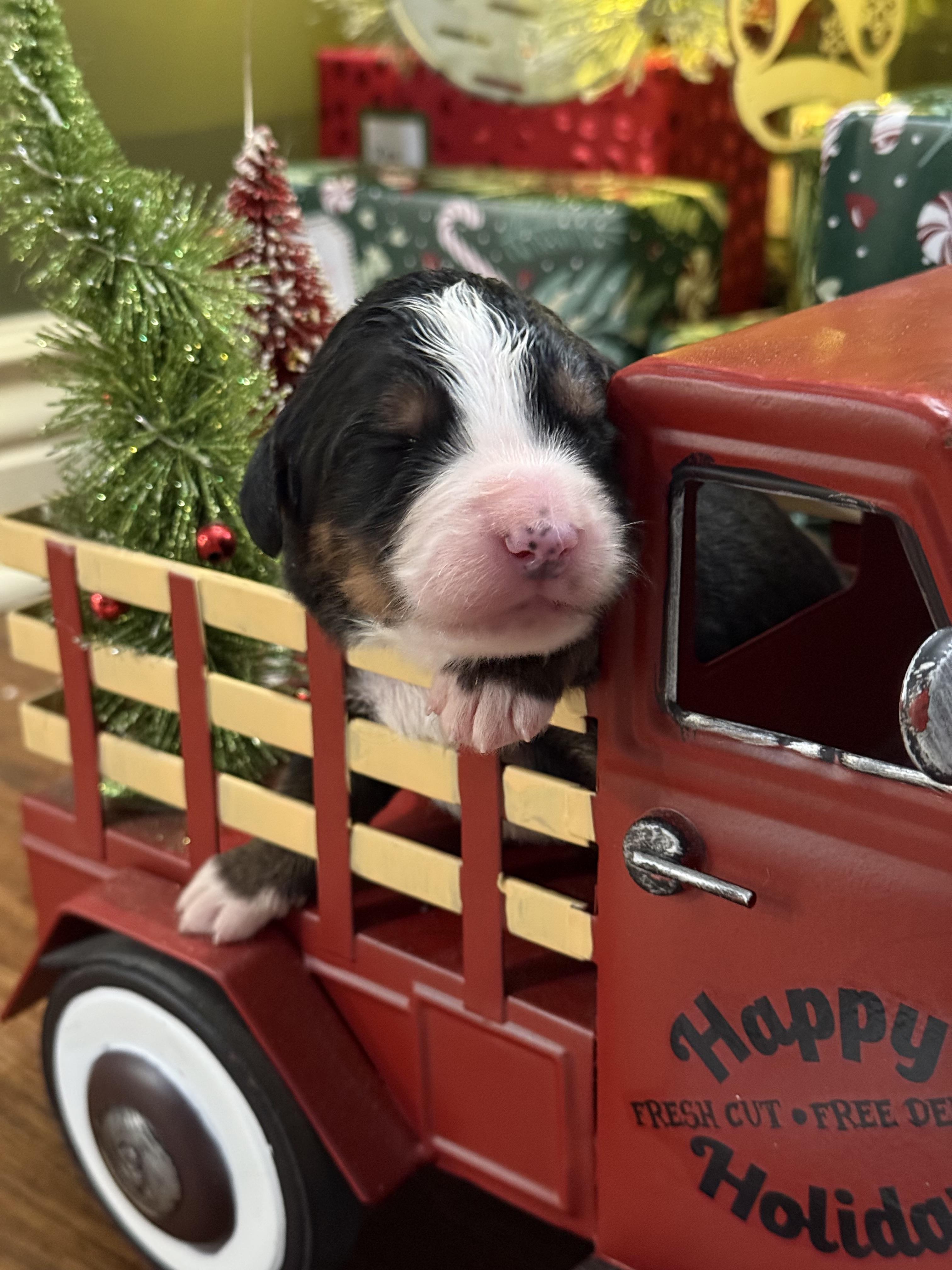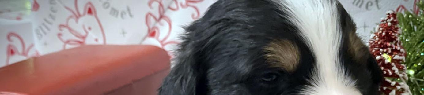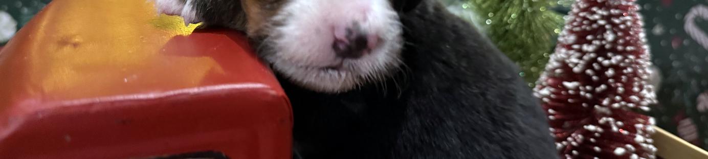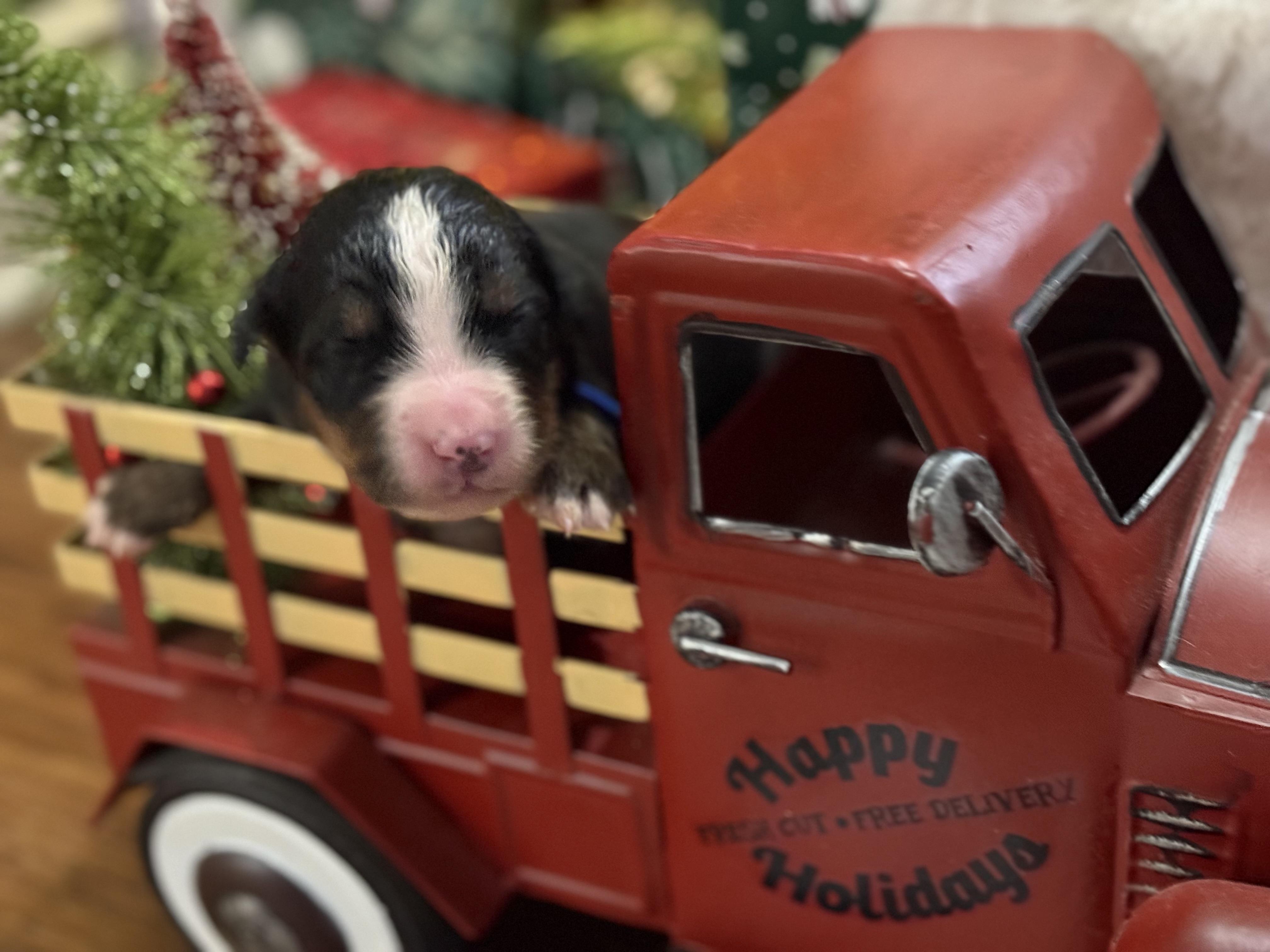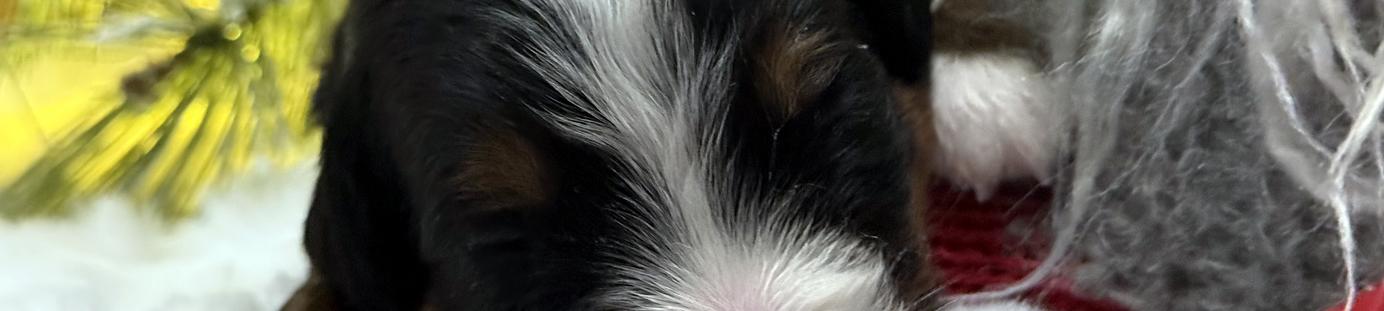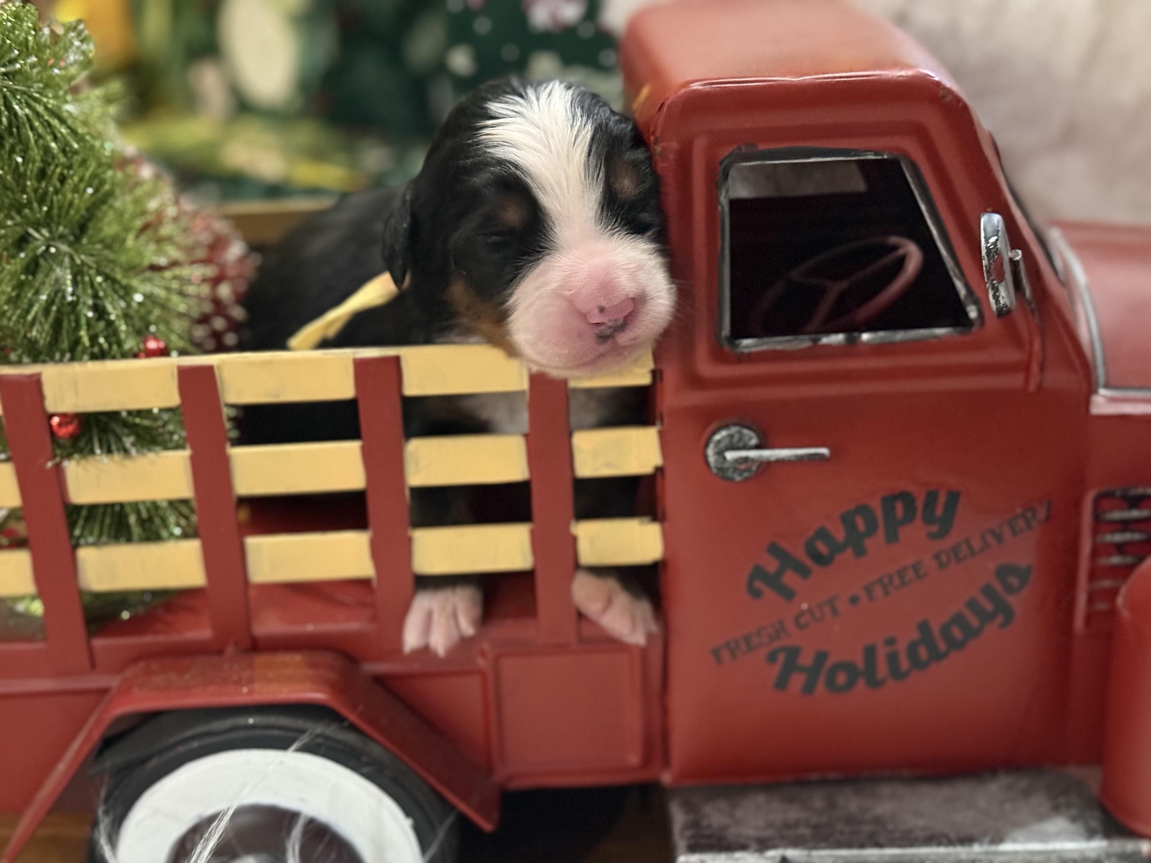 Apollo is an energetic, sweet boy and who loves to give hugs and is a definite head-turner. He weights around 100 lbs. and has the perfect markings of a champion Berner. His OFA shows good hipjoint conformation and negative for dysplasia on elbows. He’s genetically clear of DM (SOD1 & SOD1B) and VWF. He’s a proven stud, having sired a litter of outstanding puppies for a breeding program in Texas. We’re excited to start using him for our future litters and can’t wait to see what remarkable pups he produces for Faith & Family Farm.