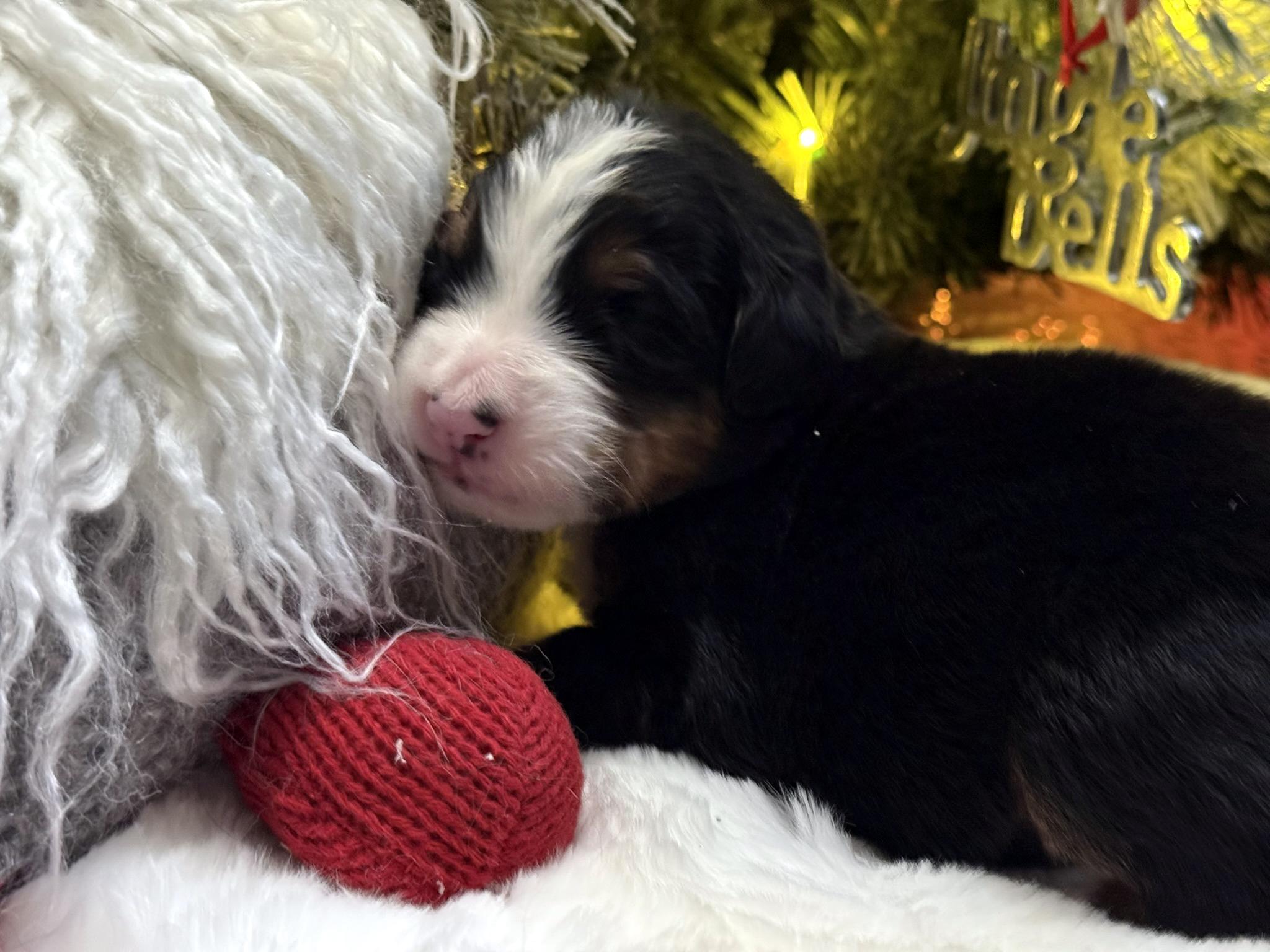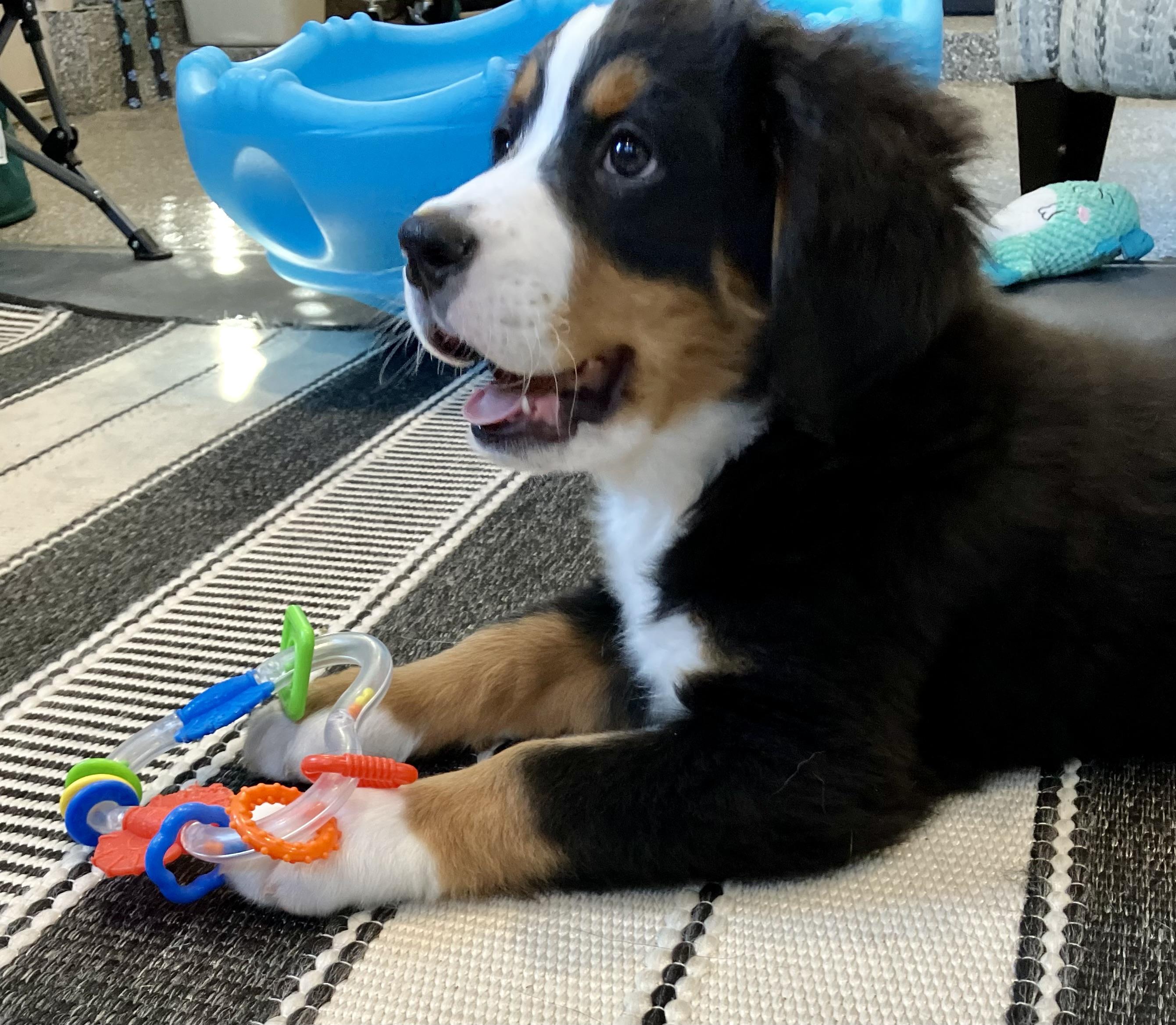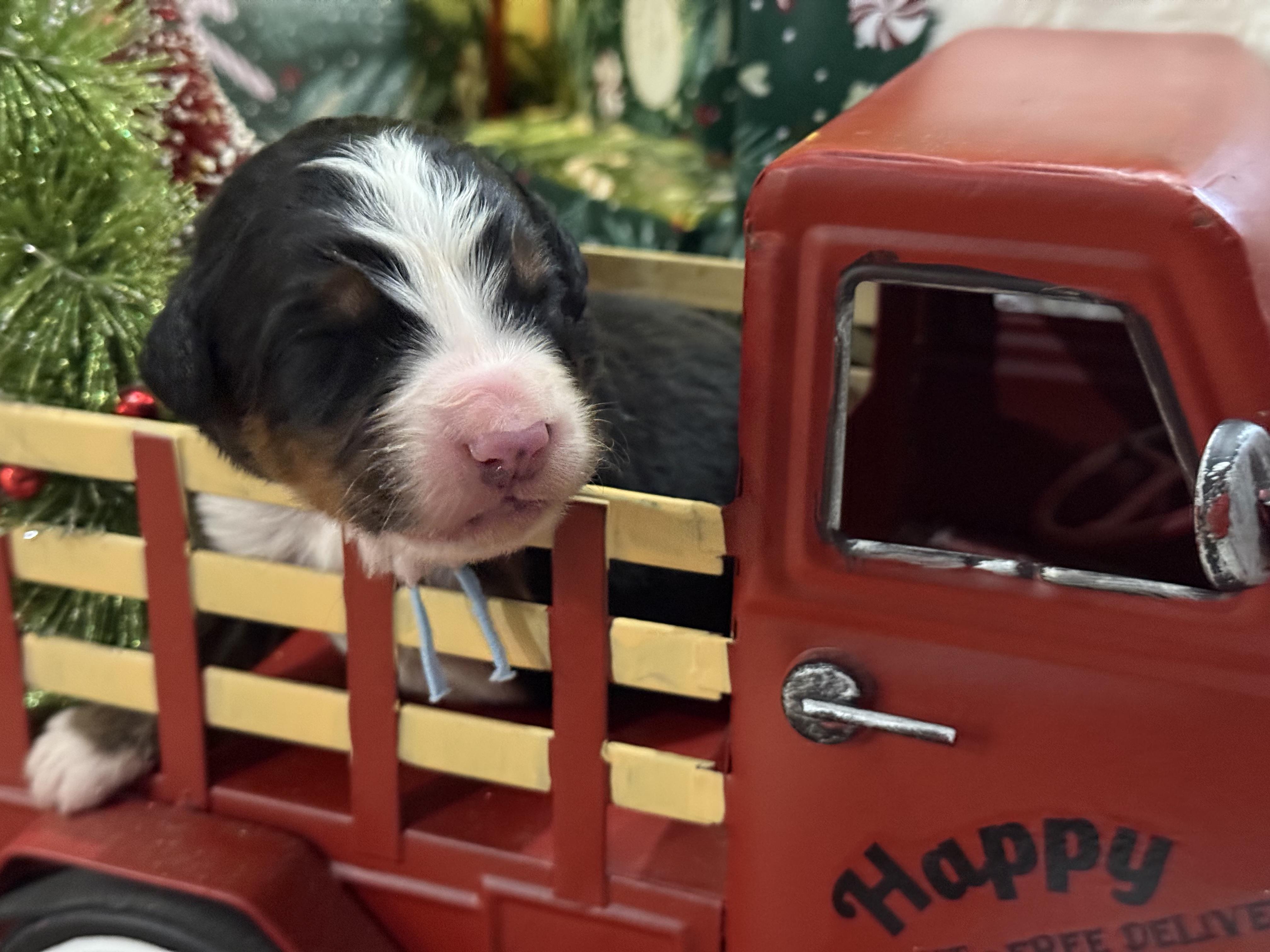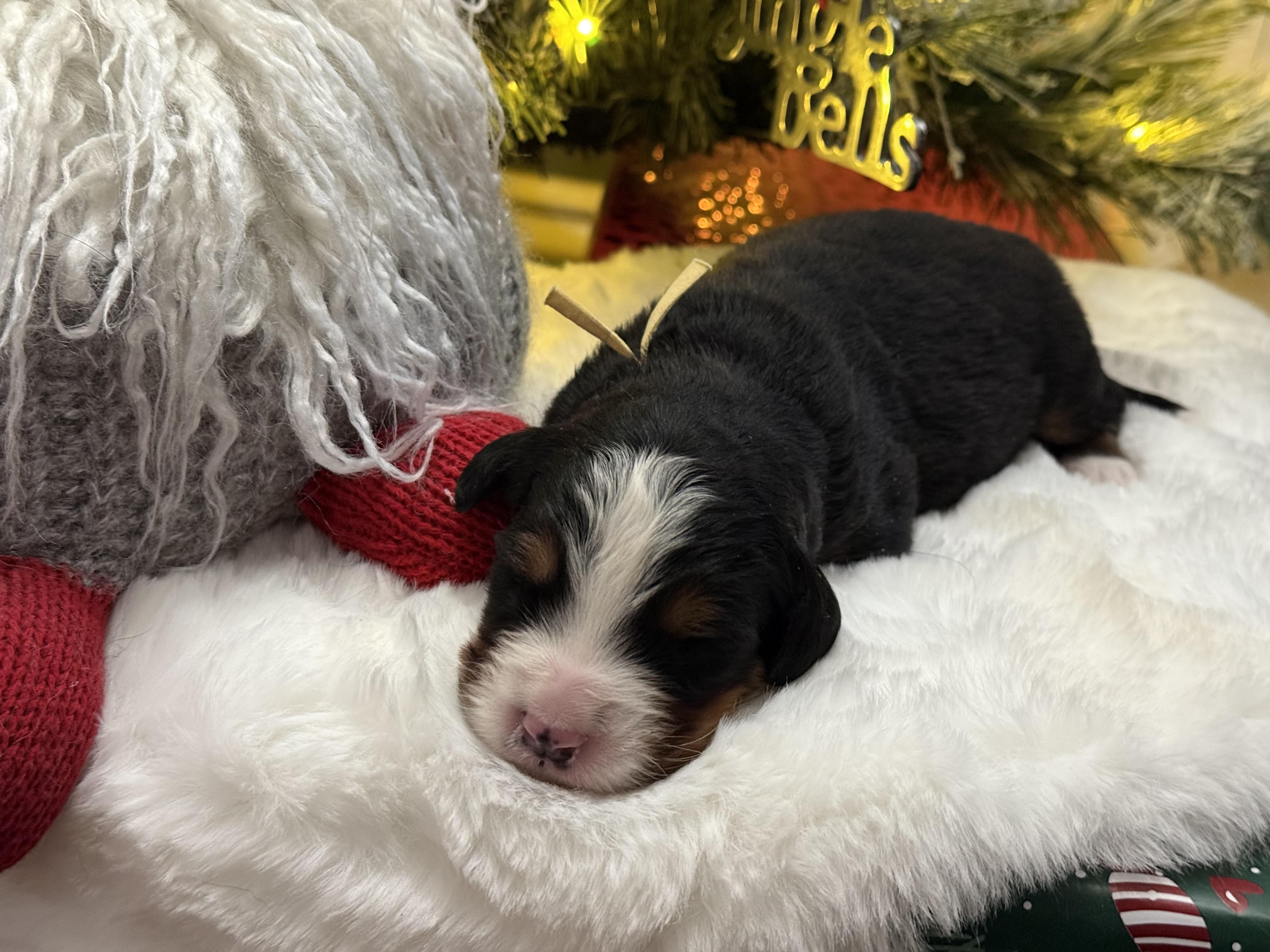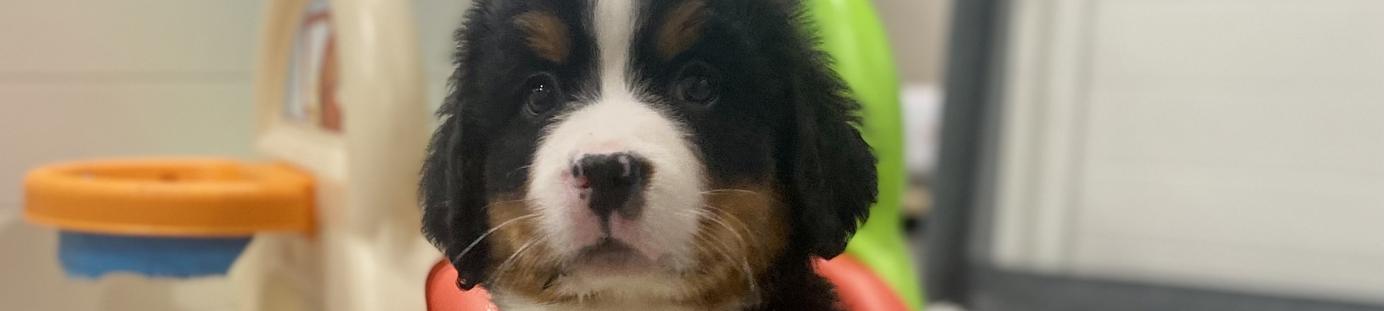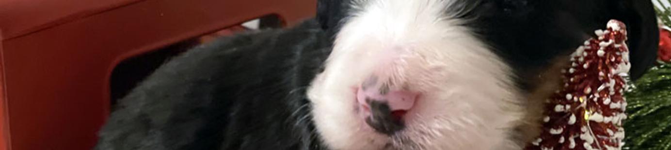 Apollo is an energetic, sweet boy and who loves to give hugs and is a definite head-turner. He weights around 100 lbs. and has the perfect markings of a champion Berner. His OFA shows good hipjoint conformation and negative for dysplasia on elbows. He’s genetically clear of DM (SOD1 & SOD1B) and VWF. He’s a proven stud, having sired a litter of outstanding puppies for a breeding program in Texas. We’re excited to start using him for our future litters and can’t wait to see what remarkable pups he produces for Faith & Family Farm.