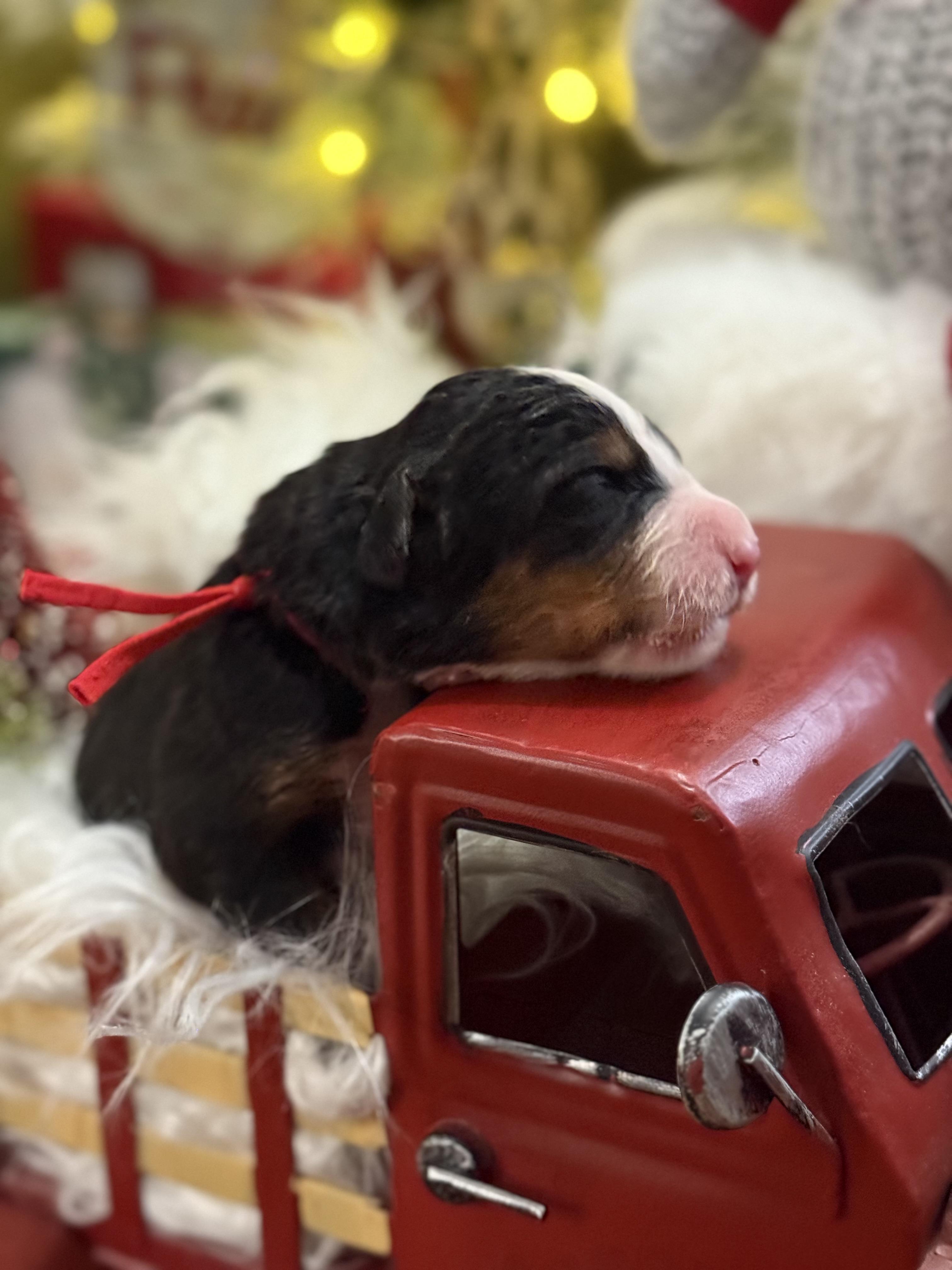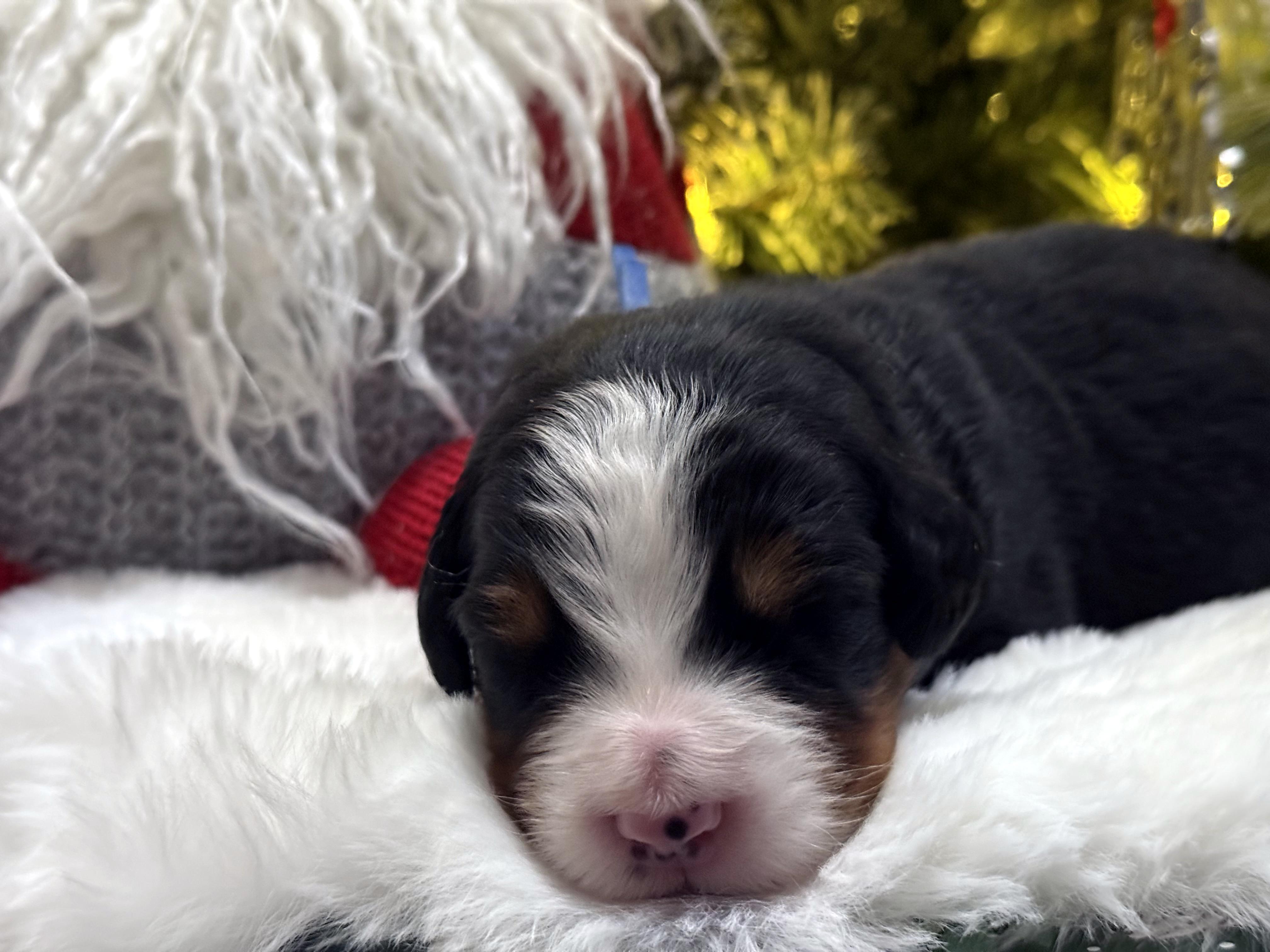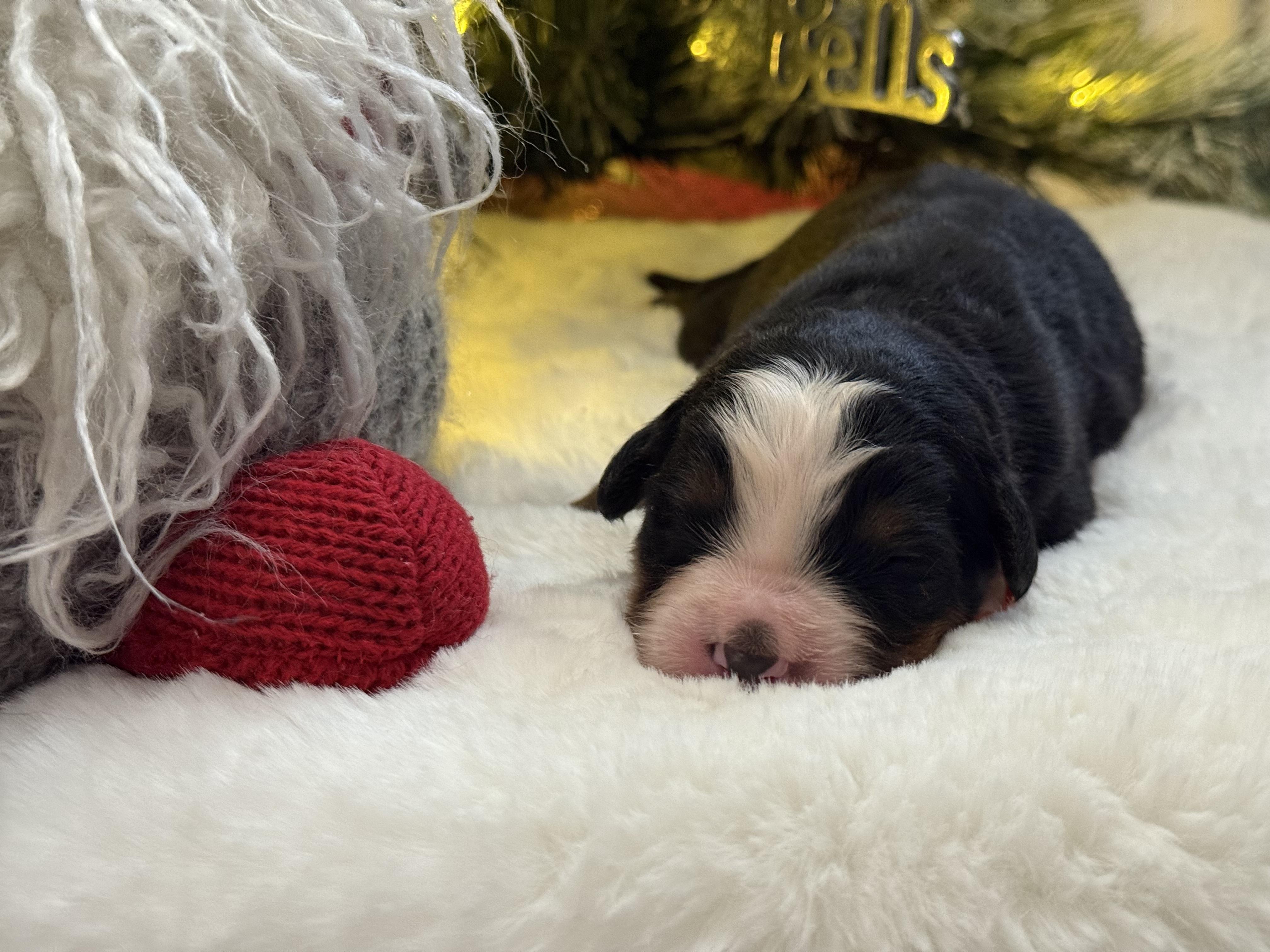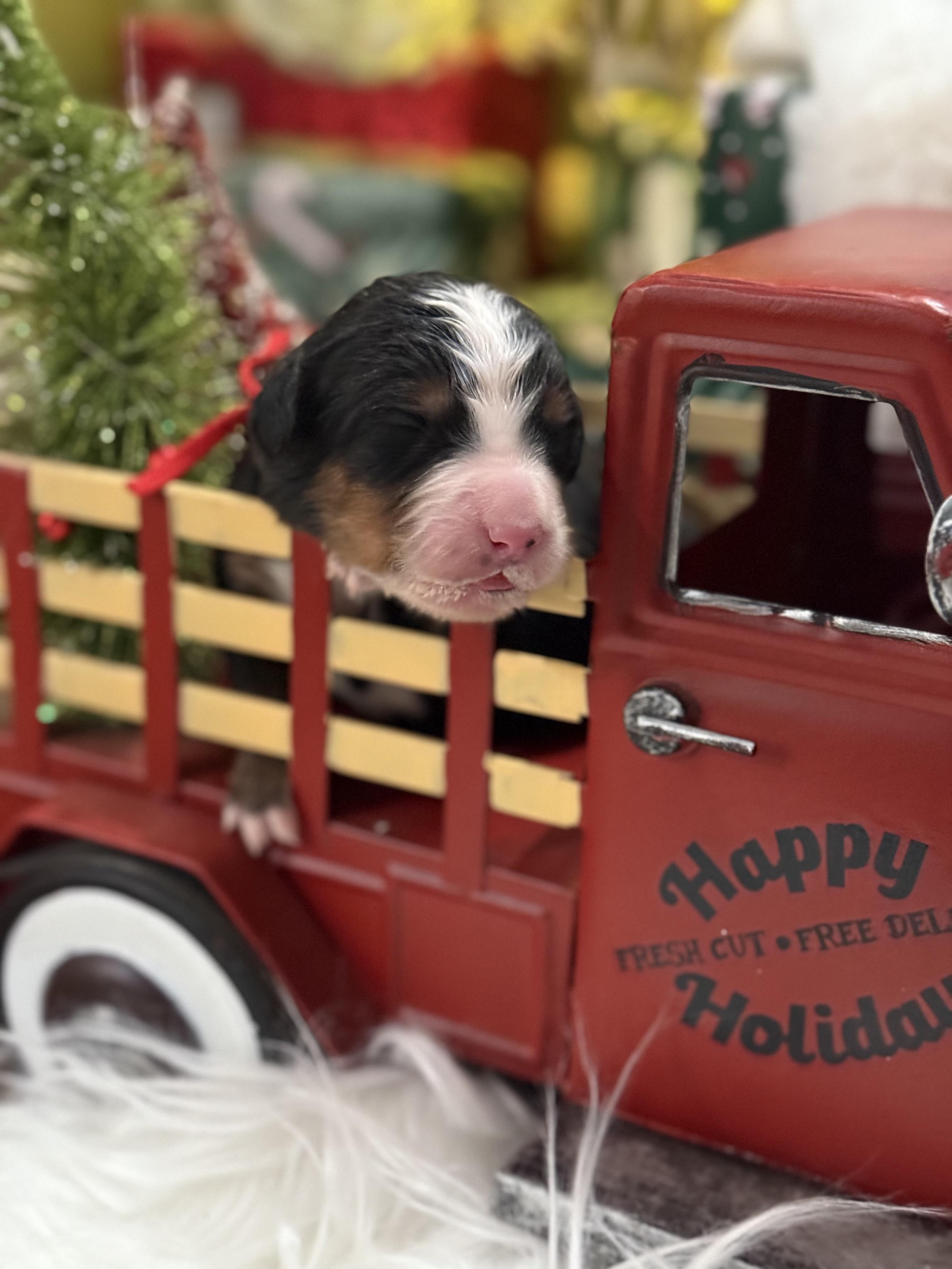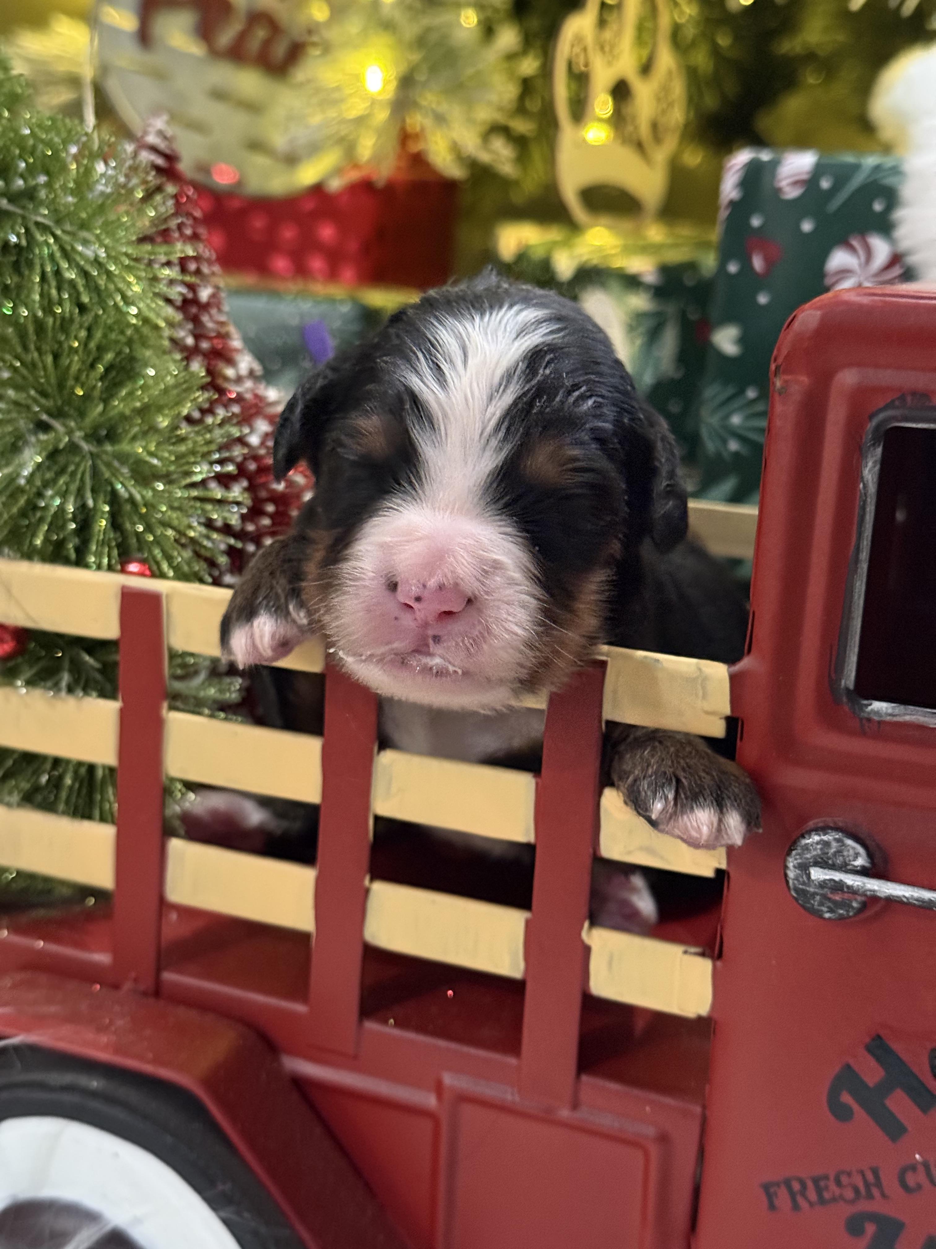 Apollo is an energetic, sweet boy and who loves to give hugs and is a definite head-turner. He weights around 100 lbs. and has the perfect markings of a champion Berner. His OFA shows good hipjoint conformation and negative for dysplasia on elbows. He’s genetically clear of DM (SOD1 & SOD1B) and VWF. He’s a proven stud, having sired a litter of outstanding puppies for a breeding program in Texas. We’re excited to start using him for our future litters and can’t wait to see what remarkable pups he produces for Faith & Family Farm.