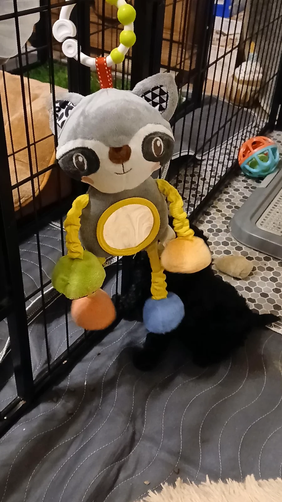 Introducing new toys and they love trying them out! This one has a mirror, squeaky feet, rattles and springy legs! Went for first vaccine/vet visit this morning and they loved the attention and hardly even noticed the shot!