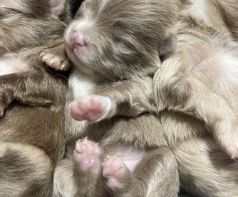 Our puppies include chocolate, chocolate and tan, and chocolate merle. Colors will vary depending on the parent dogs.
