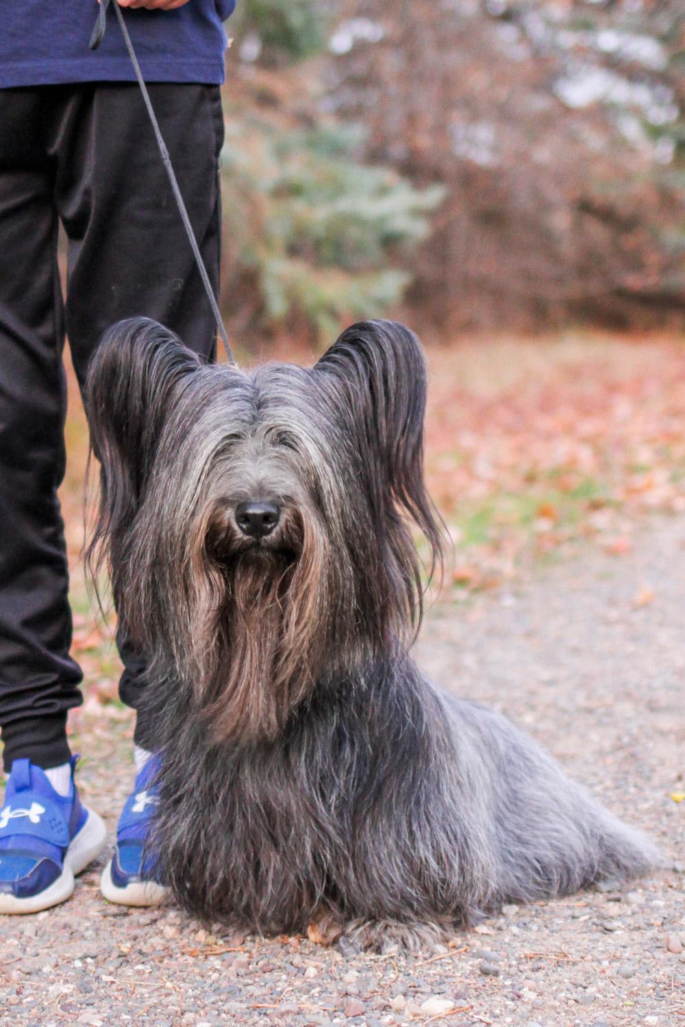 Medium sized Skye, medium grey in color with black points
