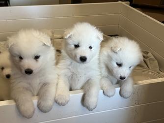 Our Samoyed puppies include white and cream. Eurasier puppies include red, sable, and fawn. Colors will vary depending on the parent dogs.