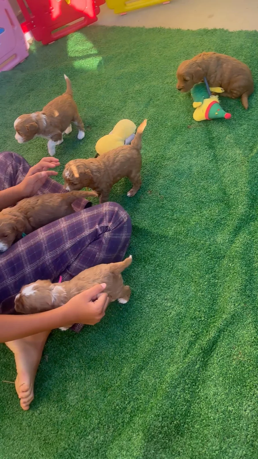 Playtime for the puppies!! We’ve started potty training on the pads and now they are introduced to turf for potty time and playtime.