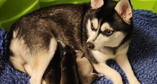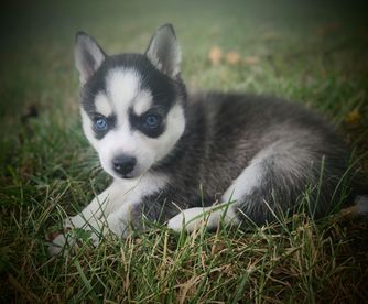 Our Alaskan Klee Kai puppies are black and white. Labrador Retriever puppies are chocolate. Colors will vary depending on the parent dogs.