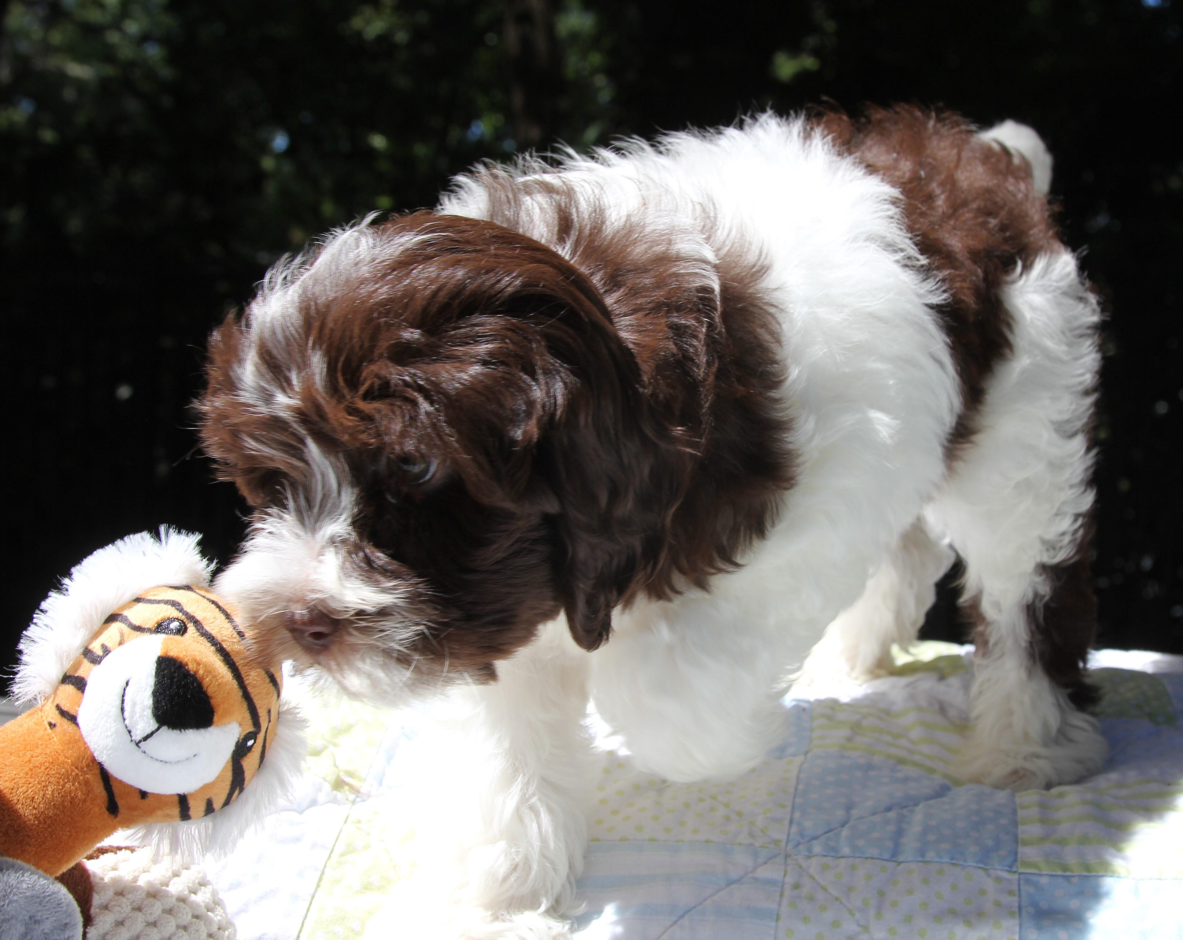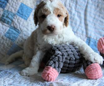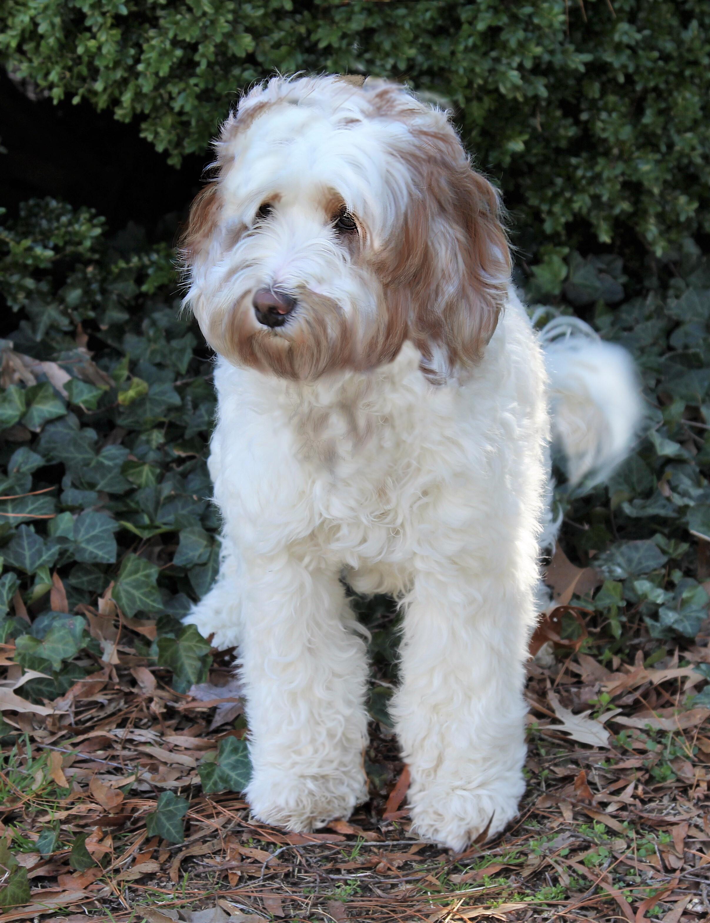 Small/petite Red and White Parti with soft wavy fleece, non-shedding, no odor, allergy friendly coat. Gorgeous dear little girl, sweet, playful and fully Health Tested for Australian Labradoodle disease panel, coat traits and carries for Red, Yellow, Chocolate, and Black.