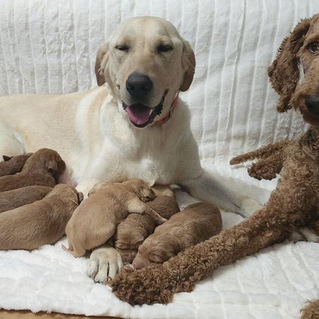 Our Labradoodle puppies include caramel, caramel red, red, gold, apricot, cream, chocolate, cafe, and parchment. Colors will vary depending on the parent dogs.