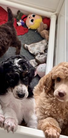 Our puppies include black, red, parti, and phantom. Colors will vary depending on the parent dogs.