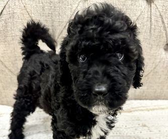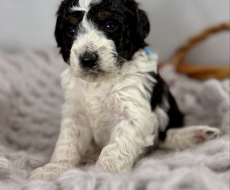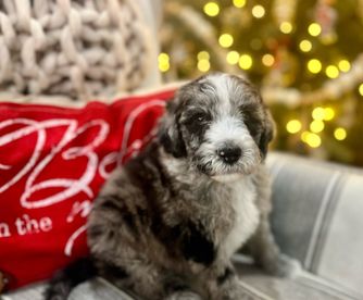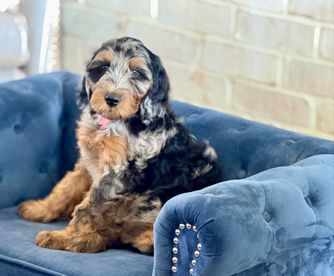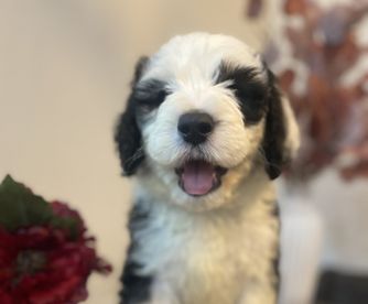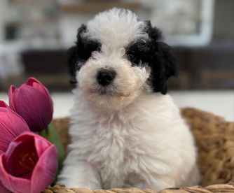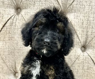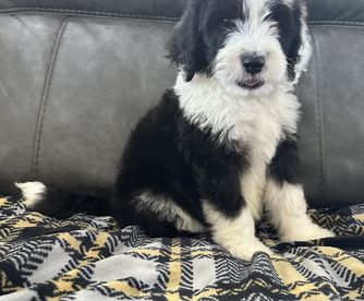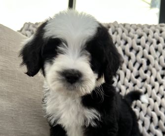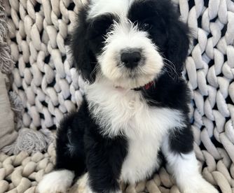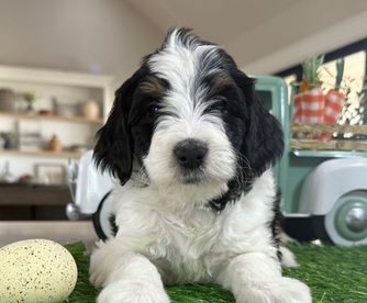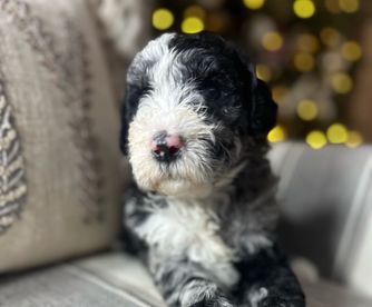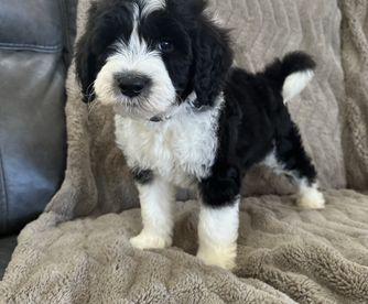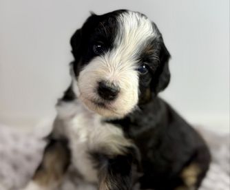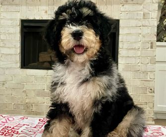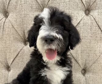 Our Bernedoodle puppies include sable, black and white, tri-color, and phantom. Sheepadoodle puppies are black and white. Colors will vary depending on the parent dogs.