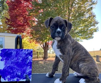Ruby Woo is a female Boxer. Carefully selected as a great representative of her breed, Amber decided to make her part of their program. Amber has passed Good Dog’s screening process, which involved a review of their breeding practices, environment, and the mental and physical health of their dogs.