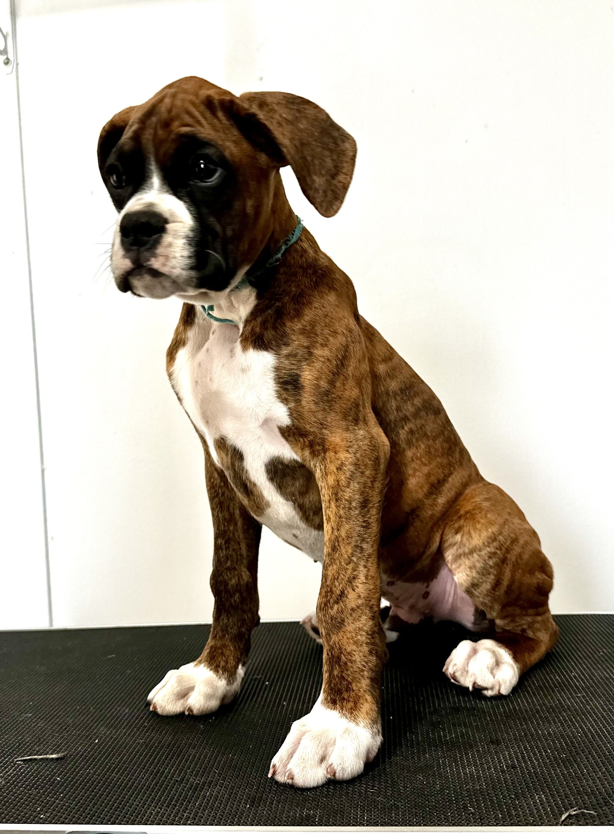 Zelle is a female Boxer. Carefully selected as a great representative of her breed, Amber decided to make her part of their program. Amber has passed Good Dog’s screening process, which involved a review of their breeding practices, environment, and the mental and physical health of their dogs.