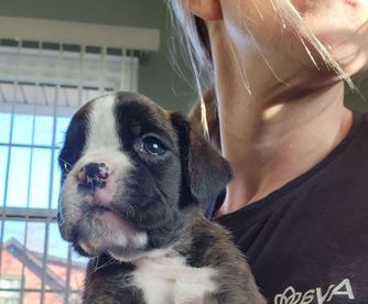 Enyo is a female Boxer. Carefully selected as a great representative of her breed, Diana decided to make her part of their program. Diana has passed Good Dog’s screening process, which involved a review of their breeding practices, environment, and the mental and physical health of their dogs.