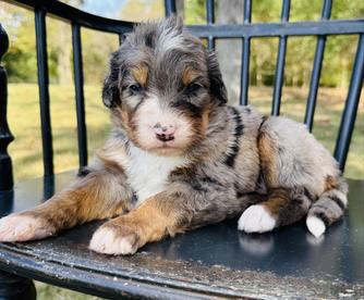 Our Pyredoodle puppies include cafe au lait, white, brown, blue, phantom, red, and parti. Bernedoodle puppies include brown, red, tri-color, phantom, and merle. Colors will vary depending on the parent dogs.