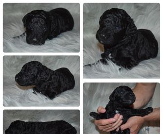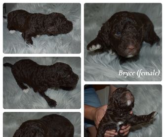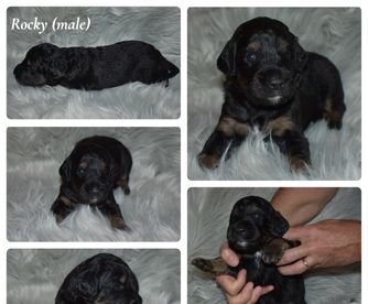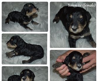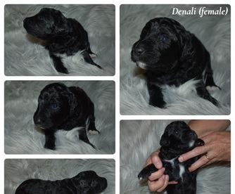 Golden Mountain Doodles are affectionate and easy to train. They are social and spirited dogs with a patient disposition and great with children. The perfect all-around companion. They are low to no shedding and considered to be hypoallergenic. Worm prevention at 3, 5, and 7 weeks. Veterinary wellness exam and vaccinated at 7 weeks old. Raised in our home interacting with people.