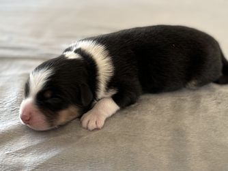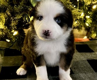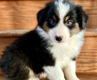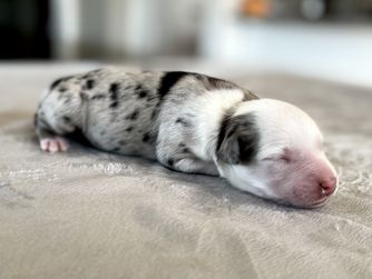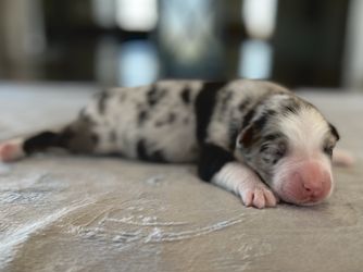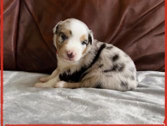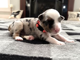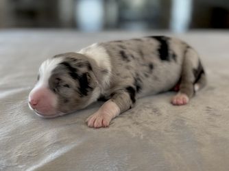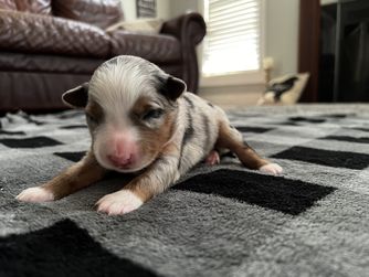 Wren is the wiggle butt king. He is always happy to be with his family. The kids can count on him to follow them wherever they go. He is a standard blue Merle. Health and genetic tested. Champion lines.