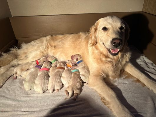 Our Goldens are part of our family. We raise them in our home and they become used to that home feel before going to their forever homes. We want to develop relationships with our families and watch our pups grow up. I feel strongly that Goldens can help mental health and understand human needs. Breeding a line that is strong in that area is very important to me!