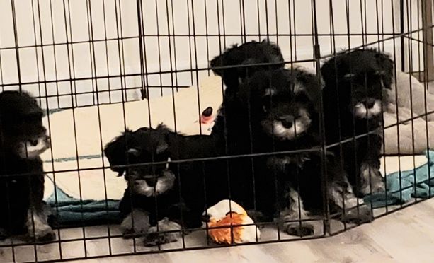 Our puppies include salt and pepper, black and silver, and black. Colors will vary depending on the parent dogs.