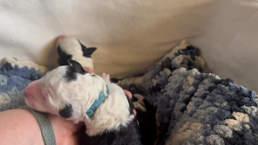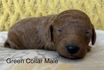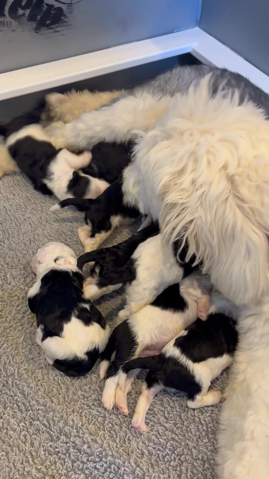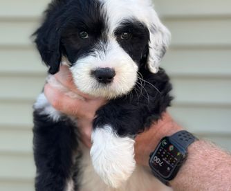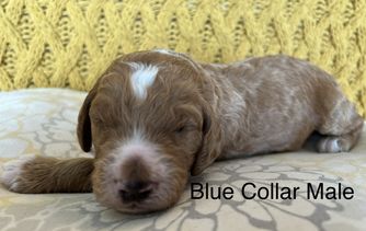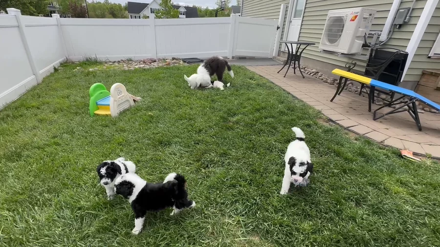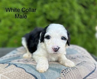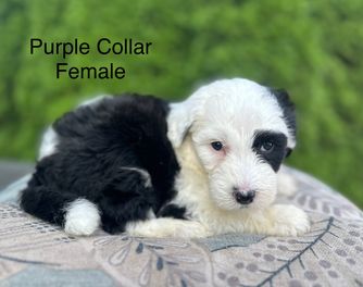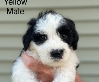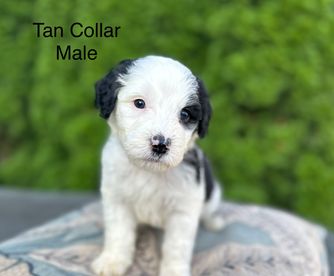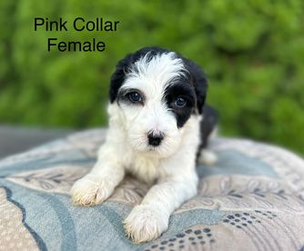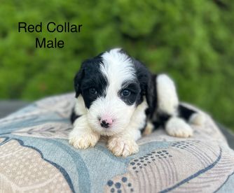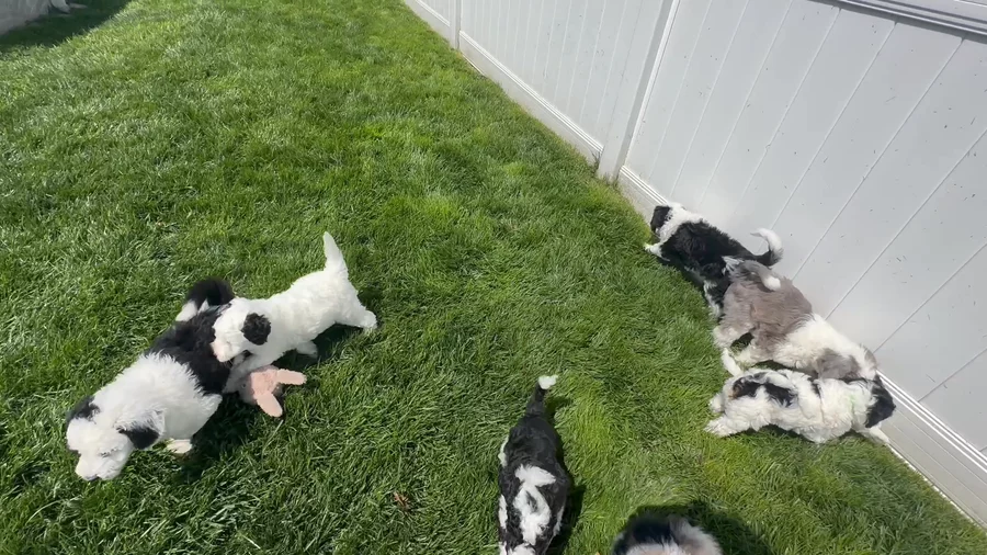 Our Goldendoodle puppies include apricot and red. Old English Sheepdog puppies include black and white and blue. Poodle puppies are parti. Sheepadoodle puppies include blue merle and white and black and white. Colors will vary depending on the parent dogs.