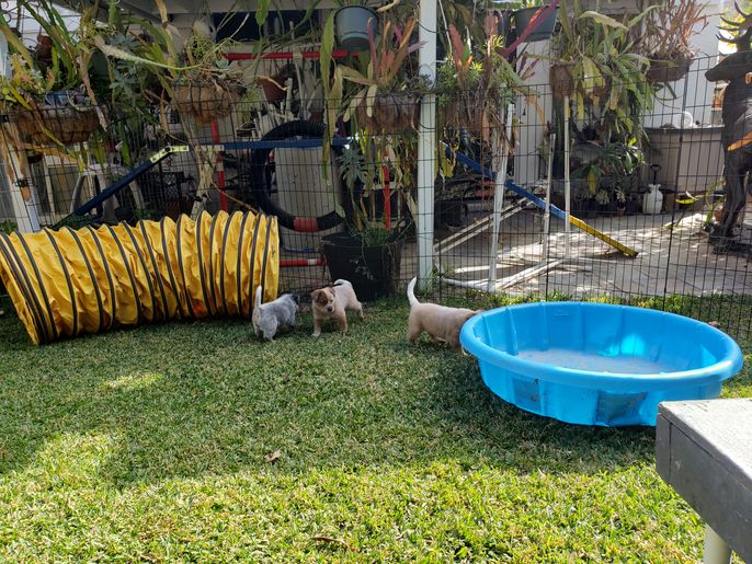 Puppies are raised in my home with a ton of attention and socializing. They have been on teters and in tunnels and seek adventure. They are started on potty training, leash walking and crate training.
