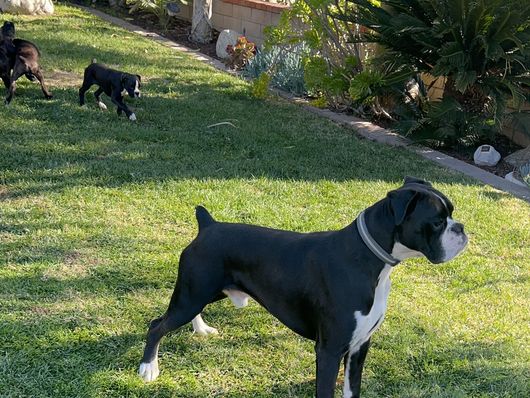 Female 2 is a female Boxer. Carefully selected as a great representative of her breed, Abe decided to make her part of their program. Abe has passed Good Dog’s screening process, which involved a review of their breeding practices, environment, and the mental and physical health of their dogs.