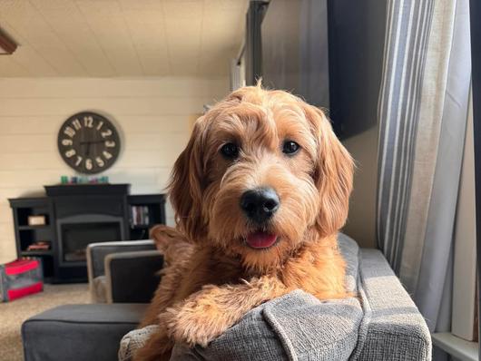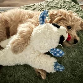 She’s 50% Poodle and 50% Golden Retriever, giving her the best blend of traits – the smarts and low-shedding coat of a Poodle with the loyal, family-friendly personality of a Golden Retriever. Eleanor loves snuggling with her people just as much as she enjoys running around the yard or playing fetch.