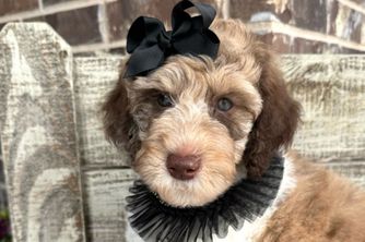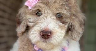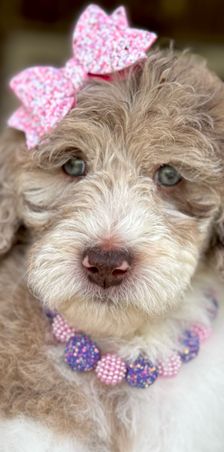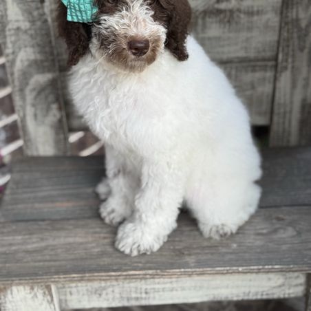 Meet Betty, our brown and white parti Goldendoodle whose vibrant personality lights up any room! As our official welcome crew, Betty has never met a stranger she didn't adore immediately, earning her the title of Miss Congeniality! Not only does she have a knack for making everyone feel loved, but she's also an exceptional mom, showing remarkable gentleness with her puppies. Despite her size, Betty is convinced she's a petite 15-pound lap dog, always ready to snuggle up and share a laugh with her endearing antics. With her irresistibly sweet and humorous nature, Betty is sure to capture your heart!