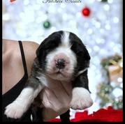 Our puppies include brown and white, brindle and white, and mahogany and white. Colors will vary depending on the parent dogs.